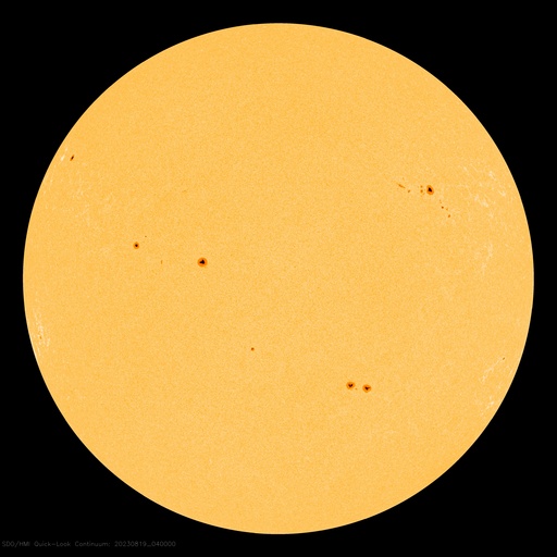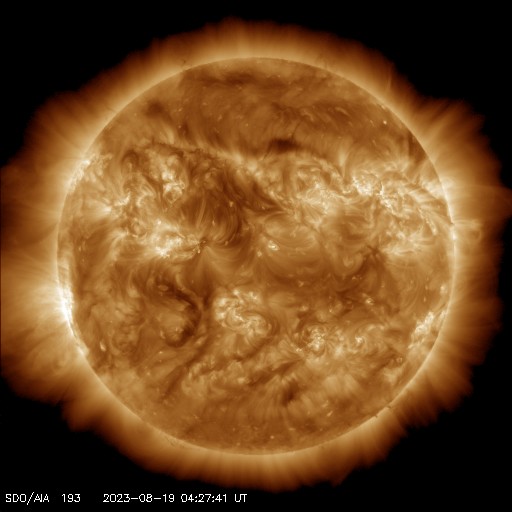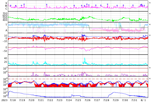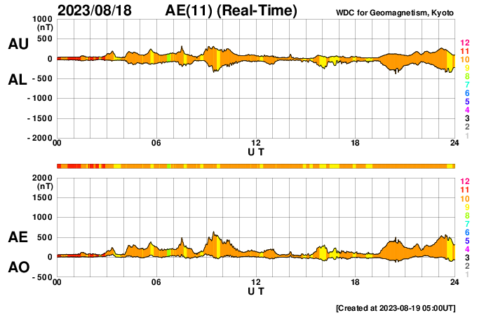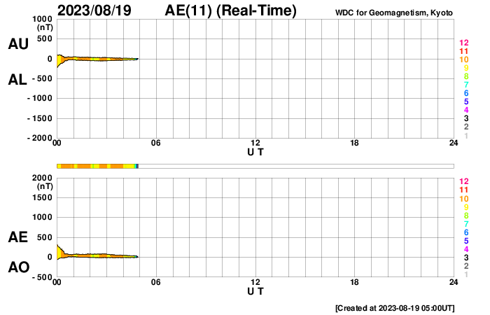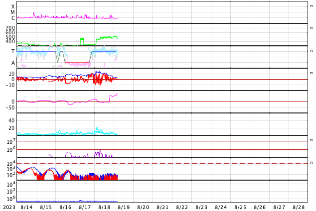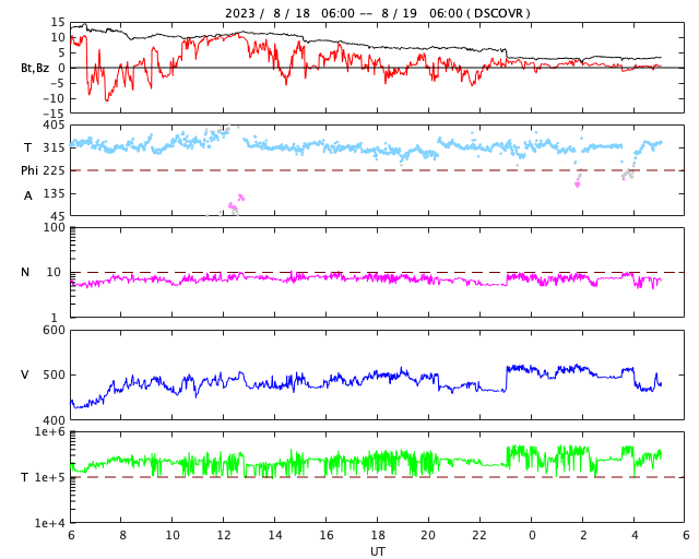 2023/ 8/19 14:19 更新 太陽風の速度が少し高まっています。太陽は穏やかです。 担当 篠原 太陽風は、昨日のニュースの直後に、 速度が330km/秒から440km/秒へ、 磁場強度は8nTから15nTヘそれぞれ高まりました。 夕方には、速度は480km/秒とやや高速の状態に達し、 現在もこの状態です。 一方、磁場強度は次第に低下して、 現在は3nTとやや弱くなっています。 磁場が強まったことで、南北成分の変化も少し大きくなり、 磁気圏の活動も少し高まっています。 AE指数は500nT程度の変化が度々発生しています。 速度の弱い高まりは、一時的な変化になりそうですが、 どのように推移するでしょうか。 太陽は、北西(右上)の3409黒点群で、 C3.7、C3.0の小規模フレアが発生した程度で、 全体としては穏やかな状態です。