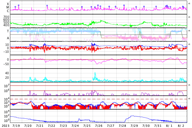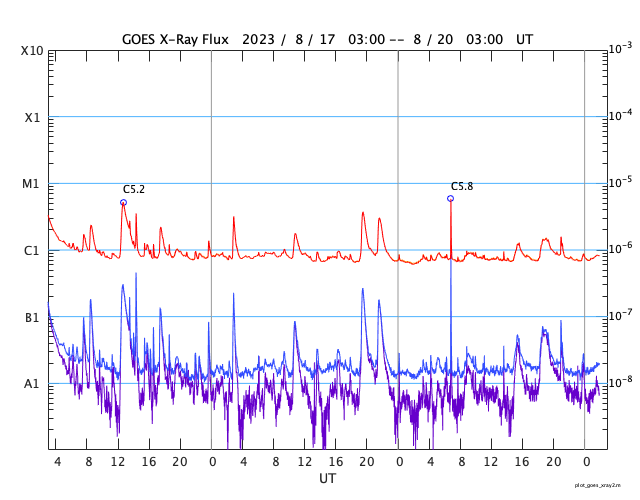GOES衛星の太陽X線強度。赤・橙 = 0.1〜0.8 nm、青・紫 = 0.05〜0.4 nm (c) データ:NOAA/SWPC、作図:宇宙天気ニュース ![]() | |||||||||||||||||||||||||||||||||||||||||||||||||||||||||||||||||||||||||||||||||||||||||||||||||||||||||||||||||||||||||||||||||||||||||||||||||||||||||||||||||||||||||||||||||||||||||||||||||||||||||||||||||||||||||||||||||||||||||||||||||||||
