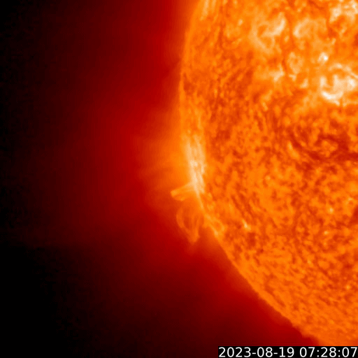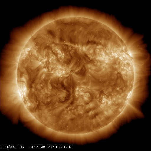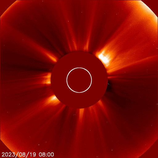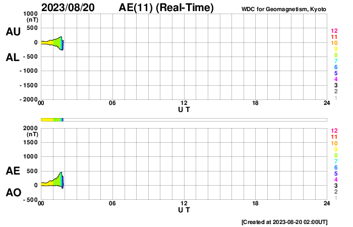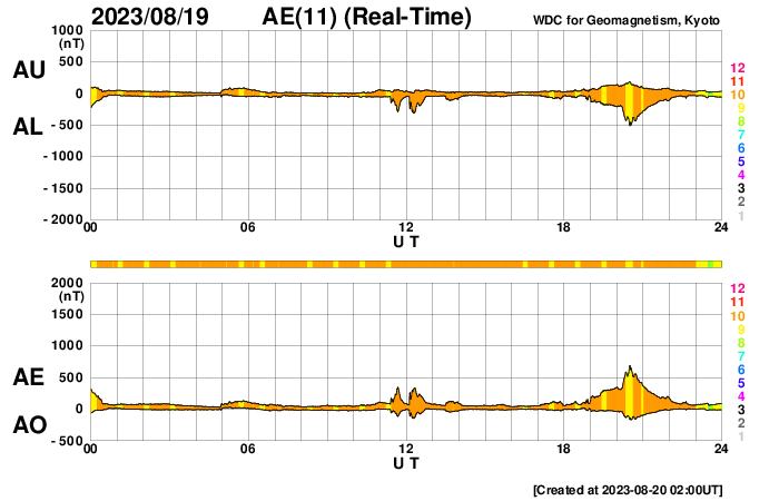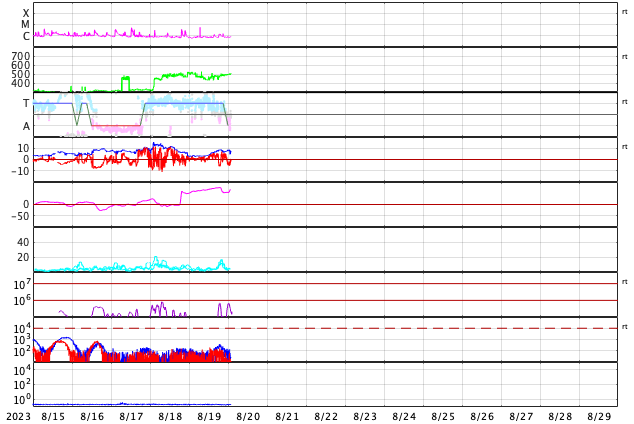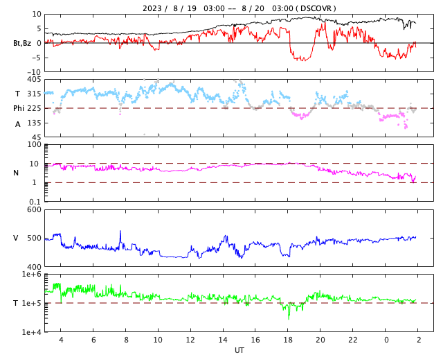 2023/ 8/20 11:07 更新 太陽風は高速になっています。太陽は穏やかです。 担当 篠原 太陽風は、磁場強度が3nTから8nTへやや強まっています。 速度も、480km/秒から450km/秒へ少し下がりましたが、 その後、500km/秒へ高まって、高速の状態になっています。 磁場の南北成分は、磁場が強まった頃から ゆっくりと南北に変化する様になっています。 このため、磁場が南寄りになった頃に 磁気圏の活動も一時的に強まって、 AE指数は、700nTの中規模の変化と、 グラフの最後に500nT程度の変化が見えています。 SDO衛星AIA193では、コロナホールは特に見えていないのですが、 この後の太陽風はどの様に推移するでしょうか。 太陽は、南西の端(右下)の3406黒点群で C5.8の小規模フレアが発生した程度で、 X線グラフの変化は少ない状態です。 一方、GOES衛星SUVI 304によると、 太陽の東端(左端)の向こう側で、 昨夕、19日18時(世界時19日9時)に、 プロミネンス噴出が発生しています。 これにより、太陽の左下に向かって CME(コロナ質量放出)が発生しています。 太陽の向こう側の現象なので、影響はありません。