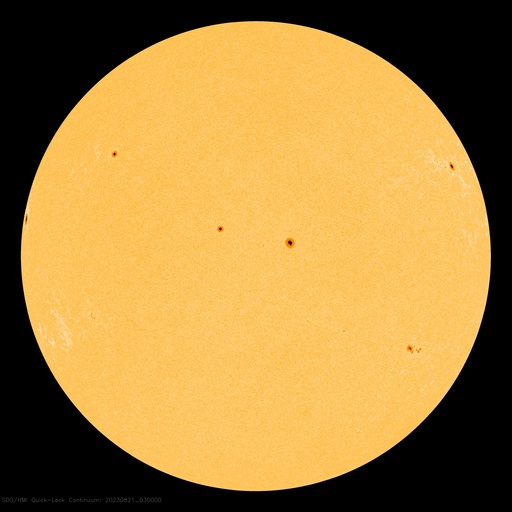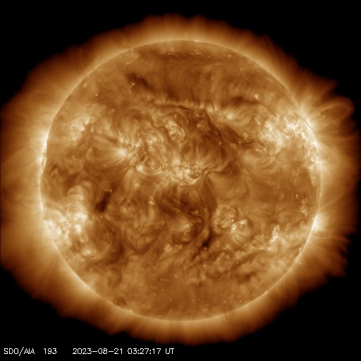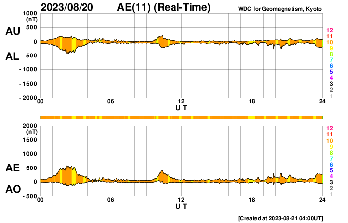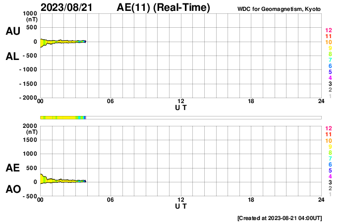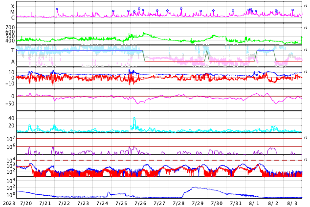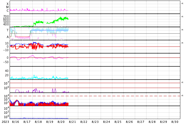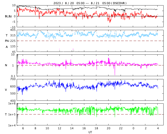 2023/ 8/21 13:11 更新 太陽風の速度は600km/秒台に高まっています。磁気圏は穏やかです。 担当 篠原 昨日、500km/秒に高まっていた太陽風の速度は、 ニュースの後も上昇を続け、 昨日の夕方には600km/秒台に達して、 以降、600〜650km/秒と高速の状態が続いています。 磁場強度は、 8nT前後と少し強まった状態が続いていましたが、 グラフの最後は6nTと平均的な値に戻っています。 磁場の南北成分は、 グラフの中盤までは北寄りで推移していて、 磁気圏は比較的穏やかな状態でした グラフの後半は、 0nT付近で小さく変化する様になっているので、 南向きの変化が見られるようになると、 磁気圏の活動も少し高まりそうです。 今回の高速風は、どの様に推移するでしょうか。 今後の変化に注目してください。 太陽は、北西の端(右上)の3409黒点群でC3.7、 南西の端(右下)でC3.3の小規模フレアが発生しています。 これらの領域は、この後は見えなくなります。 一方、南東の端(左下)でC2.0、北東の端(左上)でC3.0の 小規模フレアが発生しています。 こちら側は、今後どの様な領域が現れるでしょうか。