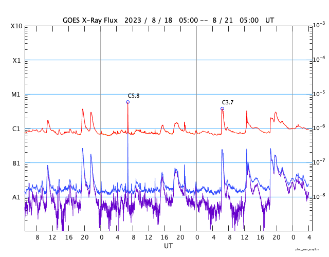 GOES衛星の太陽X線強度。赤・橙 = 0.1〜0.8 nm、青・紫 = 0.05〜0.4 nm (c) データ:NOAA/SWPC、作図:宇宙天気ニュース ![]() | ||||||||||||||||||||||||||||||||||||||||||||||||||||||||||||||||||||||||||||||||||||||||||||||||||||||||||||||||||||||||||||||||||||||||||||||||||||||||||||||||||||||||||||||||||||||||||||||||||||||||||||||||||||||||||||||||||||||||||||||||||||