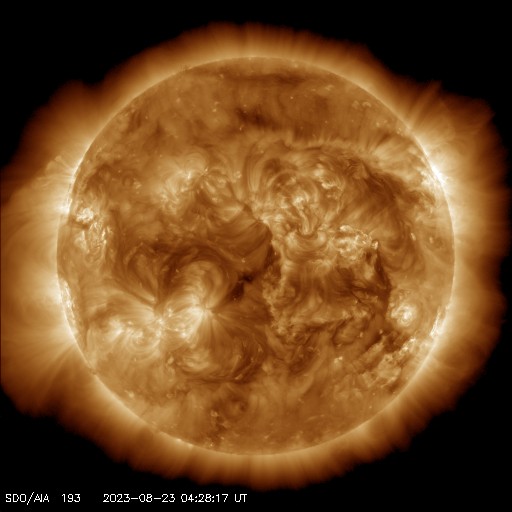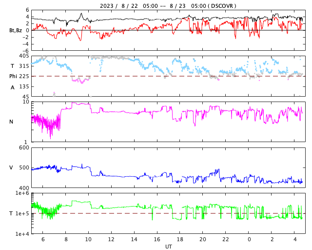 2023/ 8/23 13:52 更新 太陽風は平均的な速度に戻っています。M1.1の中規模フレアが発生しました。 担当 篠原 太陽風の速度は500km/秒から430km/秒へ下がり、 平均的な速さに戻っています。 磁場強度は3nTから4nTへ少し上がっていて、 こちらも平均的な状態です。 太陽風速度の高まりは、3日ほどで終わりました。 磁気圏は穏やかで、 AE指数は変化が少なくなっています。 太陽は、今朝、23日7時半(世界時22日22時半)に、 西側(右側)の3405黒点群で M1.1の中規模フレアが発生しました。 Mクラスに達するフレアの発生は、 8月8日のM3.6以来で、およそ2週間ぶりです。 SDO衛星AIA193(茶色の写真)の動画を見ると、 M1.1のフレアと共に3405群の左下の領域にかけて コロナの変化が発生しています。 これにより、弱いCME(コロナ質量放出)が 発生しているかもしれません。 その場合、太陽の中心に近いので、 太陽風の変化は地球へもやって来る可能性があります。 3〜4日後の26〜27日頃でしょうか。 ![]() 3405群で発生したM1.1の中規模フレアと周辺の変化の様子。 (c) SDO衛星AIA131、193 (NASA)、(動画加工 : 宇宙天気ニュース) ![]() SDO衛星のAIA193カメラによる太陽コロナの様子 (c) SDO (NASA) ![]() SDO衛星による太陽の可視光写真。マウスの矢印を写真に重ねると、黒点番号付きの写真に切り替わります。 (c) SDO (NASA) ![]() DSCOVRが観測した太陽風の磁場(黒線は全体の強度、赤線は南北成分) 磁場の向き、プラズマの密度、速度、温度 (c) データ:NOAA/SWPC、作図:宇宙天気ニュース ![]() AE指数(速報値) 下段のAEグラフの値が高くなると、オーロラ活動が活発化しています。 (c) 京都大学WDC ![]() ![]() 27日の太陽周期に合わせた図 太陽が同じ面を地球に向けていた27日前の変化から、今後を予想することができます。 (c) 作図:宇宙天気ニュース
