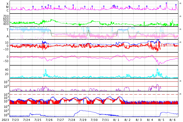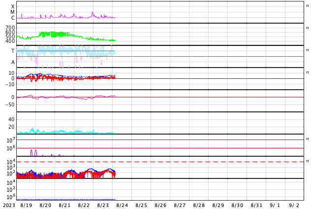 - 2023/ 8/21 13:11 太陽風の速度は600km/秒台に高まっています。磁気圏は穏やかです。