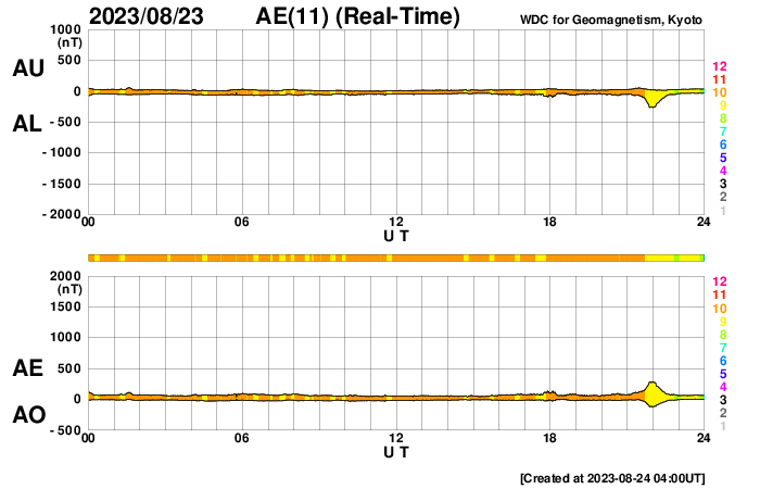 下段のAEグラフの値が高くなると、オーロラ活動が活発化しています。