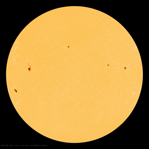 SDO衛星による太陽の可視光写真。マウスの矢印を写真に重ねると、黒点番号付きの写真に切り替わります。
