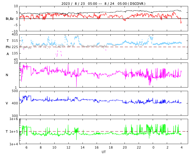 - 2023/ 8/22 13:41 高速の太陽風が続いていますが、速度は下がり始めています。