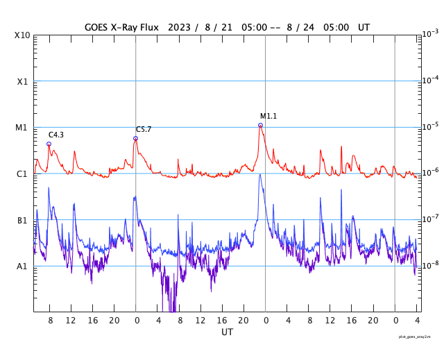 - 2023/ 8/23 13:52 太陽風は平均的な速度に戻っています。M1.1の中規模フレアが発生しました。