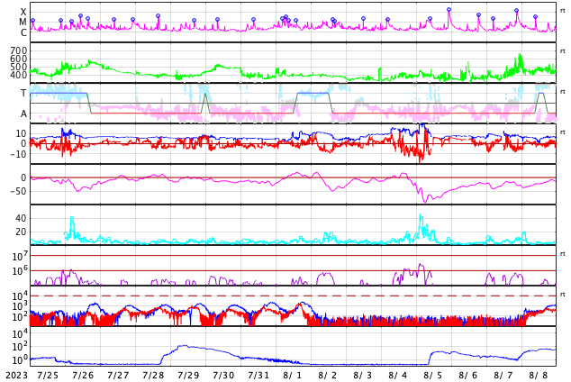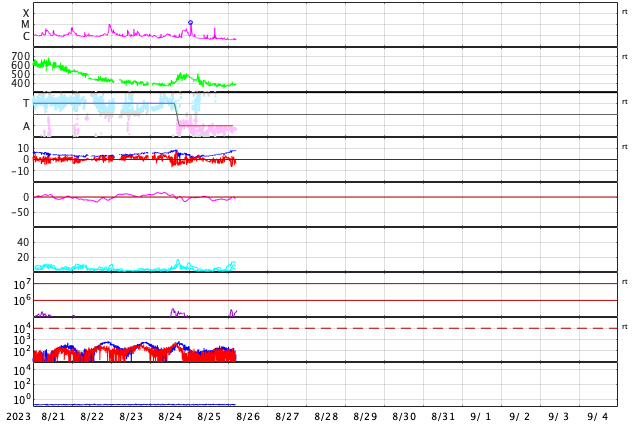 - 2023/ 8/24 13:15 太陽風は平均的な状態で、磁気圏は穏やかです。