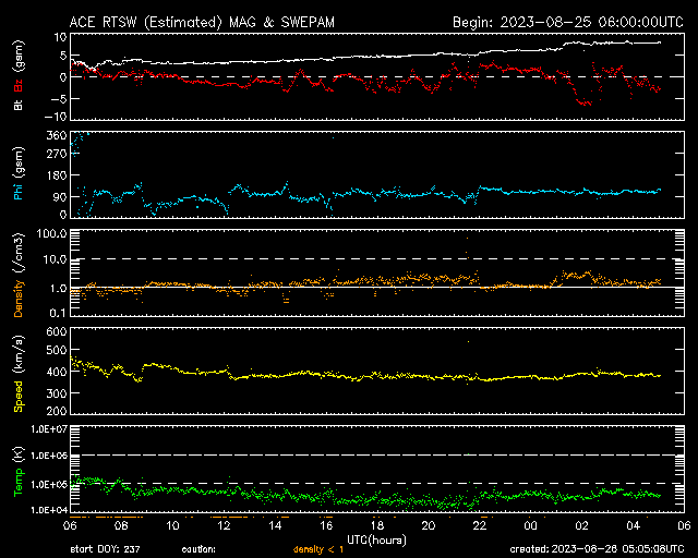 - 2023/ 8/25 13:15 太陽風はやや高速になっています。