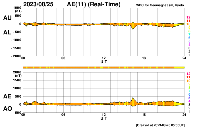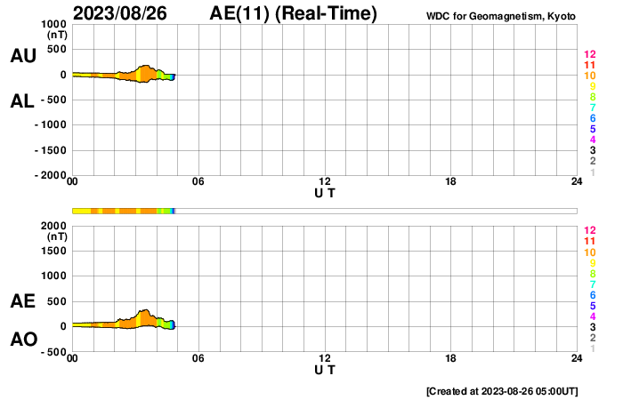 下段のAEグラフの値が高くなると、オーロラ活動が活発化しています。