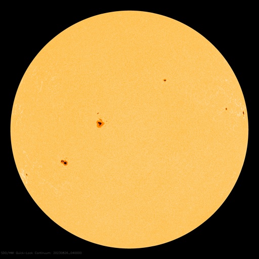SDO衛星による太陽の可視光写真。マウスの矢印を写真に重ねると、黒点番号付きの写真に切り替わります。