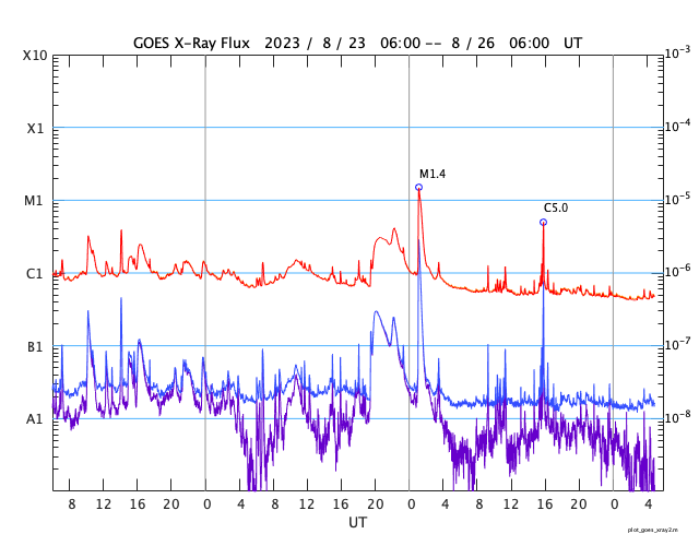 GOES衛星の太陽X線強度。赤・橙 = 0.1〜0.8 nm、青・紫 = 0.05〜0.4 nm