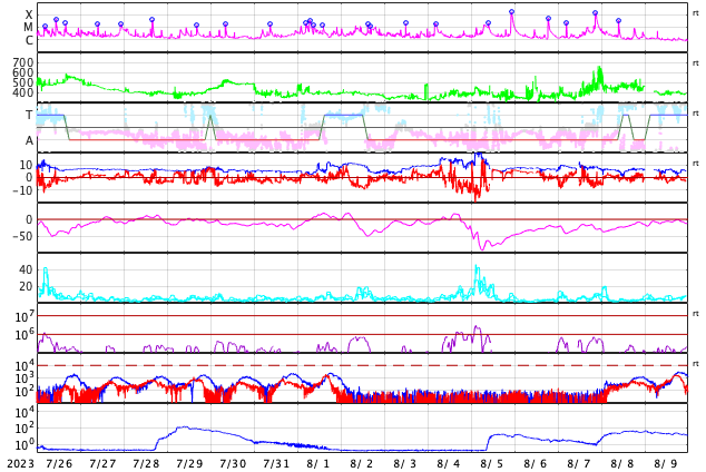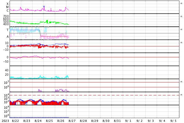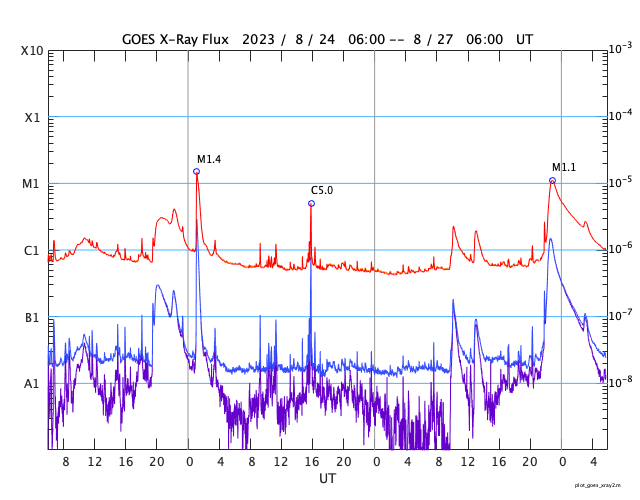 GOES衛星の太陽X線強度。赤・橙 = 0.1〜0.8 nm、青・紫 = 0.05〜0.4 nm (c) データ:NOAA/SWPC、作図:宇宙天気ニュース ![]() | ||||||||||||||||||||||||||||||||||||||||||||||||||||||||||||||||||||||||||||||||||||||||||||||||||||||||||||||||||||||||||||||||||||||||||||||||||||||||||||||||||||||||||||||||||||||||||||||||||||||||||||||||||||||||||||||||||||||||||||||