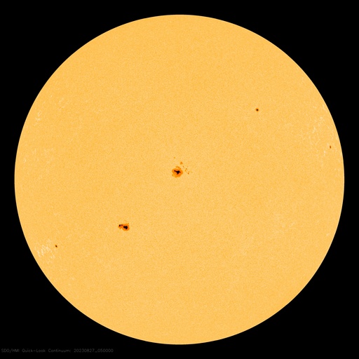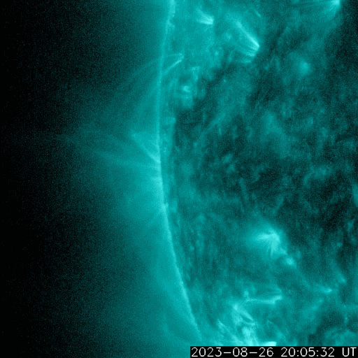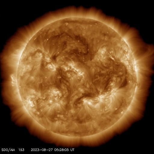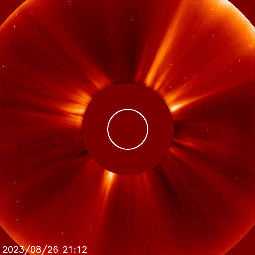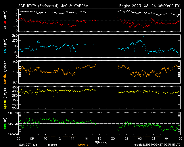 2023/ 8/27 14:51 更新 太陽風はやや低速です。太陽の東端でM1.1の中規模フレアが発生しました。 担当 篠原 太陽風の速度は、370km/秒から400km/秒へ少し上がり、 その後370km/秒へ戻る小幅の変化をしています。 現在はやや低速です。 磁場強度も7nTから5nTへ少し下がっています。 こちらは平均的な状態です。 磁場の南北成分は南寄りになっていて、 -5nT程度の南向きの変化が発生しています。 磁気圏の活動もやや強まって、 AE指数は700nTの中規模の変化が2回発生しています。 SDO衛星AIA193では、コロナホールは見えていません。 太陽では、今朝、27日7時(世界時26日22時)に、 M1.1の中規模フレアが発生しました。 SDO衛星AIA131の画像を見ると、 東端(左端)の少し向こう側で発生しています。 このため、フレアの本当の規模は これよりも大きかった可能性があります。 CME(コロナ質量放出)も大きく広がっていて、 太陽の左に向かってガスが広がる様子が SOHO衛星LASCO C2、C3でよく見えています。 地球に対しては横向きで、 少し向こう側を向いていることもあるので、 影響はないでしょう。 この後、どのような領域が現れるでしょうか。 ![]() 東端の少し向こう側で発生したM1.1の中規模フレア。 (c) SDO衛星AIA131 (NASA)、(動画加工 : 宇宙天気ニュース) ![]() 太陽の左に広がるCME。 (c) SOHO衛星LASCO C2、C3 (ESA & NASA)、(動画加工 : 宇宙天気ニュース) ![]() SDO衛星のAIA193カメラによる太陽コロナの様子 (c) SDO (NASA) ![]() SDO衛星による太陽の可視光写真。マウスの矢印を写真に重ねると、黒点番号付きの写真に切り替わります。 (c) SDO (NASA) ![]() ACEが観測した太陽風の磁場(1番上の枠、白線は全体の強度、赤線は南北成分) および、太陽風の密度(3番目の橙線)、速度(4番目の黄線) (c) NOAA/SWPC ![]() AE指数(速報値) 下段のAEグラフの値が高くなると、オーロラ活動が活発化しています。 (c) 京都大学WDC ![]() ![]() 27日の太陽周期に合わせた図 太陽が同じ面を地球に向けていた27日前の変化から、今後を予想することができます。 (c) 作図:宇宙天気ニュース