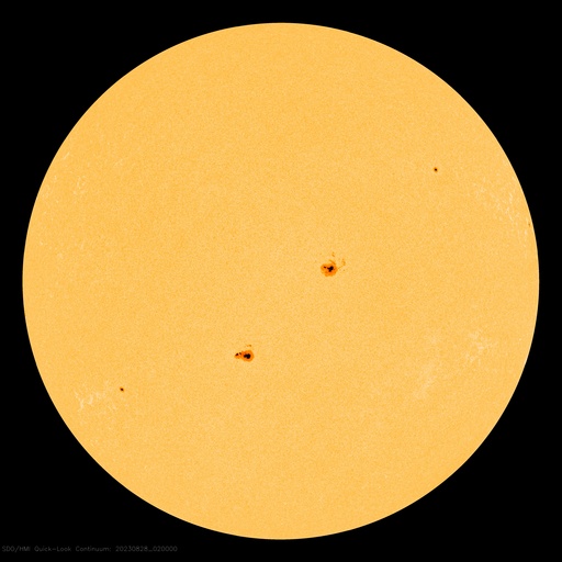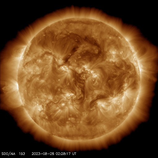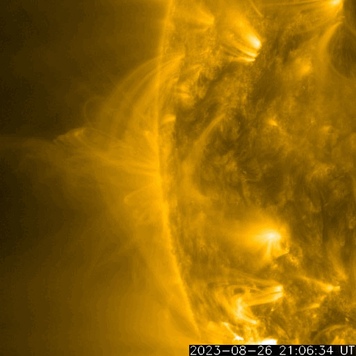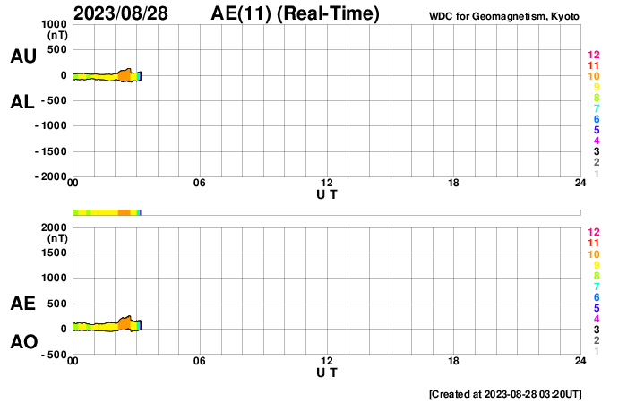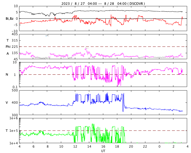 2023/ 8/28 12:37 更新 太陽風は低速になっています。太陽は穏やかです。 担当 篠原 太陽風は、途中のデータが乱れていますが、 速度は380km/秒から330km/秒へゆっくり下がり、 低速の状態になっています。 磁場強度は、6nTと平均的な状態が続いています。 磁場の南北成分は、南寄りの傾向が続いています。 このため、磁気圏の活動は少し高まっていて、 AE指数は300〜500nTの小規模の変化が度々発生しています。 太陽風の速度が下がって来たので、 磁気圏活動の変化は小さくなりそうです。 昨日のM1.1中規模フレア以降は、 X線グラフに特に変化はなく、 太陽は穏やかです。 M1.1フレアを起こしたと思われる黒点が、 可視光写真の東端(左端)に見え始めています。 この後の活動はどうなるでしょうか。 注目して下さい。 SDO衛星AIA171では、 昨日のM1.1フレアに続いて、 ポストフレアループがきれいに見えていました。 動画を掲載します。 ![]() 27日7時(世界時26日22時)のM1.1フレアに続いて現れたポストフレアループ。 (c) SDO衛星AIA171 (NASA)、(動画加工 : 宇宙天気ニュース) ![]() SDO衛星のAIA193カメラによる太陽コロナの様子 (c) SDO (NASA) ![]() SDO衛星による太陽の可視光写真。マウスの矢印を写真に重ねると、黒点番号付きの写真に切り替わります。 (c) SDO (NASA) ![]() DSCOVRが観測した太陽風の磁場(黒線は全体の強度、赤線は南北成分) 磁場の向き、プラズマの密度、速度、温度 (c) データ:NOAA/SWPC、作図:宇宙天気ニュース ![]() AE指数(速報値) 下段のAEグラフの値が高くなると、オーロラ活動が活発化しています。 (c) 京都大学WDC ![]() ![]() 27日の太陽周期に合わせた図 太陽が同じ面を地球に向けていた27日前の変化から、今後を予想することができます。 (c) 作図:宇宙天気ニュース