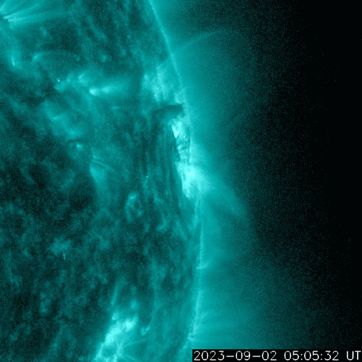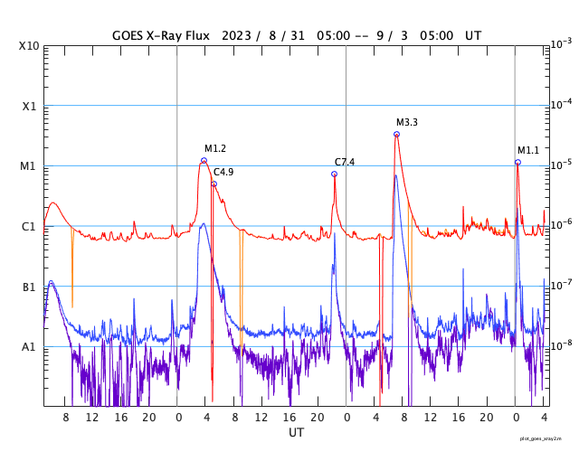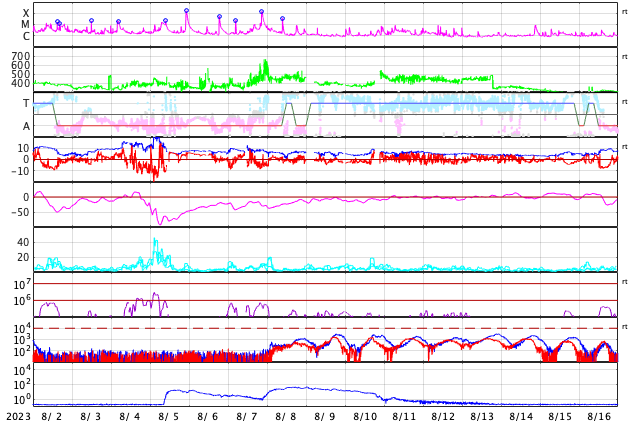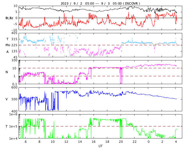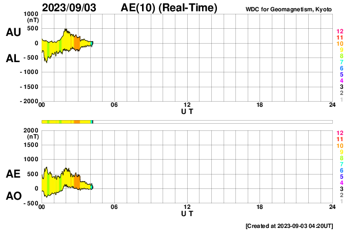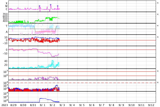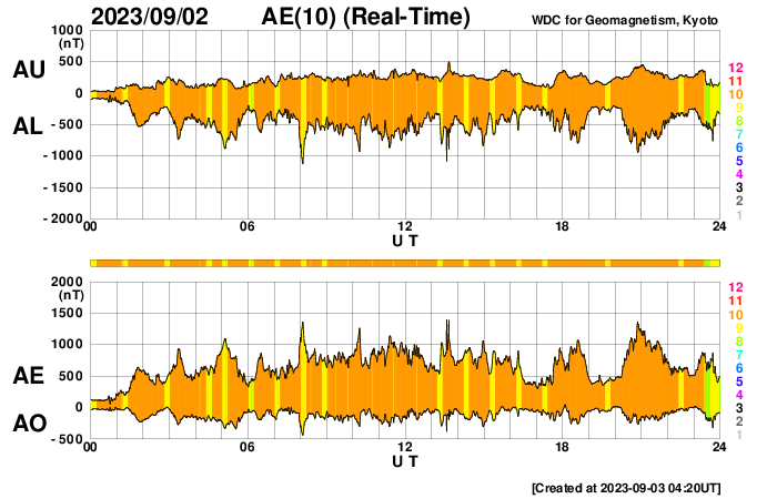 2023/ 9/ 3 13:30 更新 太陽風は高速の状態が続き、磁気圏の活動も高まっています。 担当 篠原 昨日の午後、2日15時半(世界時2日6時半)に、 太陽の西の端(右端)の3413黒点群で、 M3.3の中規模フレアが発生しました。 SDO衛星AIA131の動画を掲載します。 CME(コロナ質量放出)も発生していますが、 太陽の右下に向かっていて、地球への影響はないでしょう。 3413群は、今朝、3日9時(世界時3日0時)にも M1.1の中規模フレアを起こしましたが、 現在は太陽の向こう側に進んでいて、見えなくなっています。 太陽風は、550km/秒に速度が高まり、 その後ゆっくり下がって、現在は500km/秒です。 高速の状態は続いています。 磁場強度は、5〜9nTの間を上下していて、 やや強まった状態です。 磁場の南北成分は、 昨日のフレア以降、南寄りになって、 -5nTを超える程度の南向きの変化が度々発生しています。 速度が高まっていることもあって、 磁気圏の活動は強まり、 AE指数は、1000nT前後の活発な変化が 1日にわたって続いています。 太陽風のグラフの最後で、 磁場の南北成分は、北寄りに変化しています。 この状態が続くなら、 この後の磁気圏は穏やかになるでしょう。 再び南向きで変化すると、 磁気圏も活動的な状態が続くでしょう。 注目して下さい。