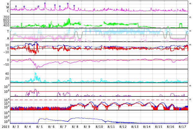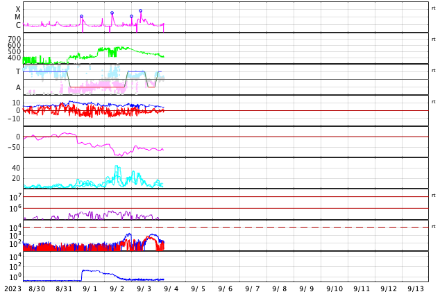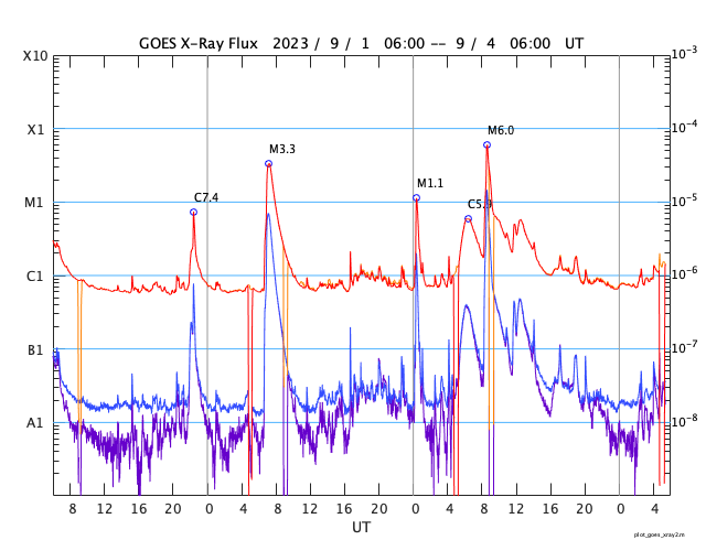 GOES衛星の太陽X線強度。赤・橙 = 0.1〜0.8 nm、青・紫 = 0.05〜0.4 nm (c) データ:NOAA/SWPC、作図:宇宙天気ニュース ![]() | |||||||||||||||||||||||||||||||||||||||||||||||||||||||||||||||||||||||||||||||||||||||||||||||||||||||||||||||||||||||||||||||||||||||||||||||||||||||||||||||||||||||||||||||||||||||||||||||||||||||||||||||||||||||||||||||||||||||||||||||||||||||||