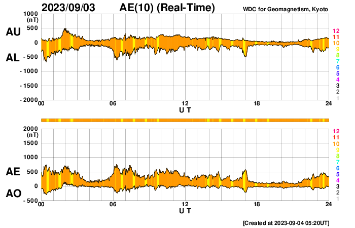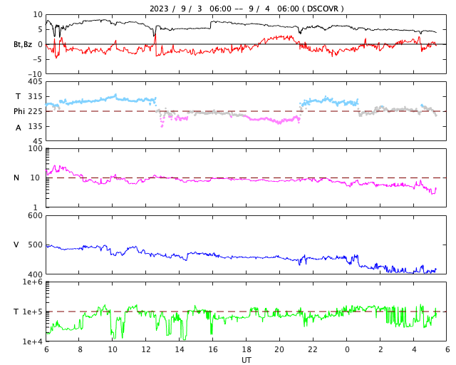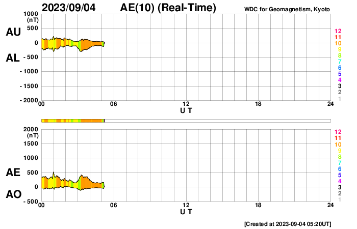 2023/ 9/ 4 14:40 更新 太陽風は平均的な状態に戻っています。ニュージーランドのオーロラをどうぞ。 担当 篠原 昨日のニュースで紹介したように、 世界時9月2日に入った頃から、 太陽風速度が高まり、磁場が南向きにやや強まったため、 磁気圏の活動が強まっていました。 この頃、現地2日20時(世界時2日8時)頃に、 ニュージーランド南島クィーンズタウンで撮影されたオーロラの写真を 米戸 実さんよりいただきました。 この日は、満月の2日後と月がまだ大きく、 月が上がってくるまでの限られた時間内での撮影だったとのことです。 1枚目の写真の右端が青いのは薄明の影響だとのことです。 南の地平線から美しいグラデーションでオーロラの光が広がっています。 2枚目の写真は、対角魚眼レンズを使っているので、 上から2/5辺りが天頂で、その上は北の空になるそうです。 天頂と思われる場所の右上にさそり座が写っています。 3、4枚目の写真では、上の方に赤い光の帯がもう1本増えていて、 オーロラが二重の様に見えています。 この上の光はSAR Arcだとのことです。 SAR Arcは、磁気嵐による環電流の高エネルギープラズマから エネルギーが供給されて発生している現象で、 通常のオーロラとは電子が降り込むまでの経路が異なります。 赤い光は酸素原子によるもので、通常のオーロラと同じものです。 赤い光に強い改造カメラならではの素晴らしい写真を、 どうもありがとうございます。 現在の太陽風は、 速度は500km/秒から400km/秒へ下がり、 平均的な速さに戻っています。 磁場強度も5nTで落ち着いていて、 こちらも平均的な状態です。 磁場の南北成分は、 グラフの中盤までは弱い南寄りの傾向が続いていて、 AE指数は、500nTくらいの変化が度々発生しています。 グラフの最後では、速度と磁場強度は下がり、 南北成分は0nT付近で小さく変化しています。 この状態が続くと、磁気圏の活動も穏やかになるでしょう。 太陽では、昨日の夕方、3日17時(世界時3日8時)に、 西の端に沈んだ3413黒点群でM6.0の中規模フレアが発生しました。 SDO衛星AIA131の動画を掲載します。 M6.0に達する規模のフレアは、 世界時8月7日のX1.5以来で、およそ1か月ぶりです。 その直前にC5.9、直後にC5.0、C5.7の 小規模フレアも発生していて、 フレアの輝きが活発に続きます。 画像でも分かりますが、 太陽の端の向こう側で発生しているので、 本当の規模はこれらよりも大きかった可能性があります。 活動が1週間ほど早ければ、 噴出したCME(コロナ質量放出)による乱れが 地球へ向かって来ていたでしょう。