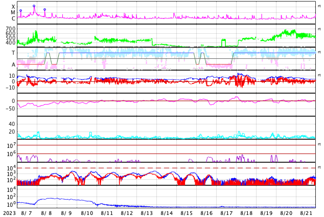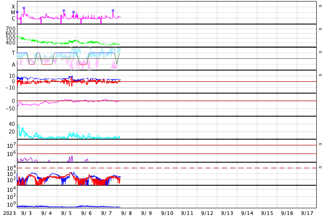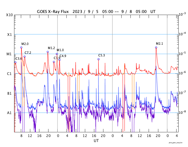 GOES衛星の太陽X線強度。赤・橙 = 0.1〜0.8 nm、青・紫 = 0.05〜0.4 nm (c) データ:NOAA/SWPC、作図:宇宙天気ニュース ![]() | ||||||||||||||||||||||||||||||||||||||||||||||||||||||||||||||||||||||||||||||||||||||||||||||||||||||||||||||||||||||||||||||||||||||||||||||||||||||||||||||||||||||||||||||||||||||||||||||||||||||||||||||||||||||||||||||||||||||||||||||||||||||||||||||||||||||||||||||||||||||