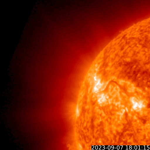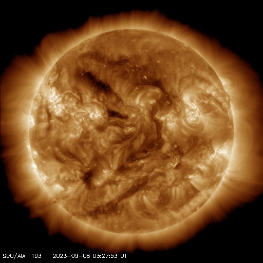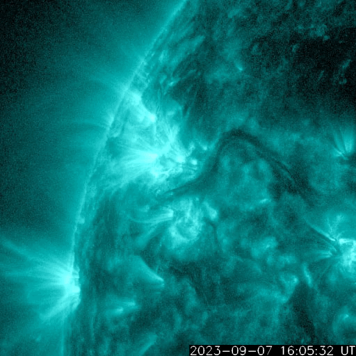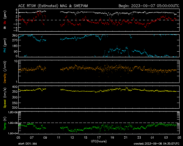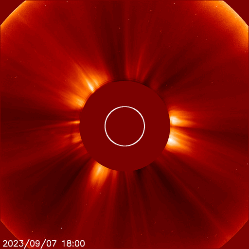 2023/ 9/ 8 13:36 更新 太陽風は低速になっています。M2.1の中規模フレアが発生しました。 担当 篠原 太陽風の速度は350km/秒へ下がり、低速になっています。 磁場強度は4nTと平均的な状態です。 磁場の南北成分は弱い南寄りですが、 速度が下がっているため磁気圏は穏やかで、 AE指数は小規模の変化が時々起きている程度です。 SDO衛星AIA193の太陽コロナ写真では、 中心部の北東側(左上)に小さいコロナホールが見えています。 4日後くらいから太陽風に影響が見られるかもしれません。 今朝早く、8日4時(世界時7日19時)に、 太陽の北東の端(左上)の3425黒点群で、 M2.1の中規模フレアが発生しました。 SDO衛星AIA131とGOES衛星SUVI 304の動画を掲載します。 SOHO衛星LASCO C2、C3を見ると、 CME(コロナ質量放出)が太陽の左上に向かって飛び出しています。 地球に対して横向きの噴出なので影響はありません。 これから3425群は太陽の中心へ向かって進むため、 CMEの影響は地球へ及びやすくなります。 今後の活動に注目してください。