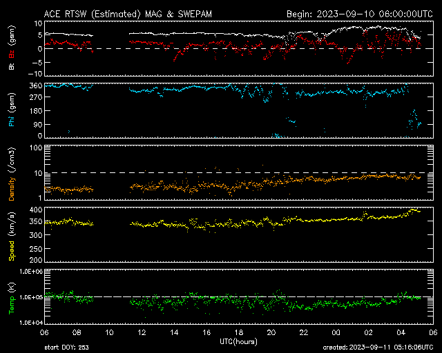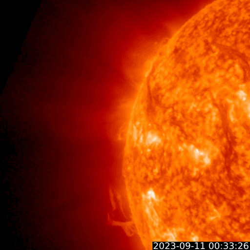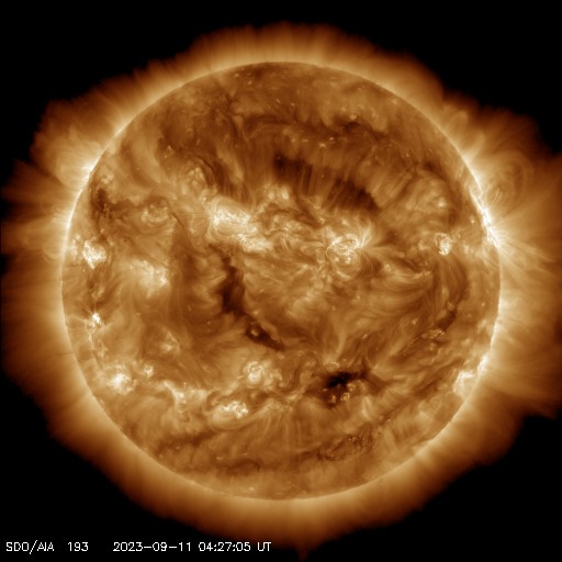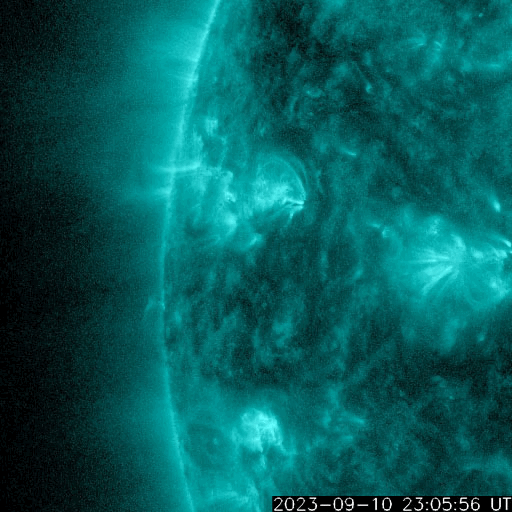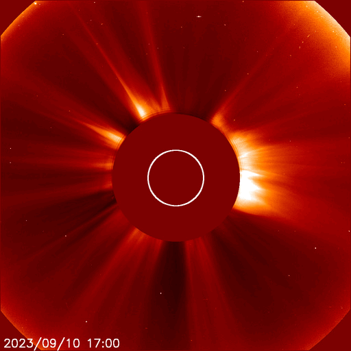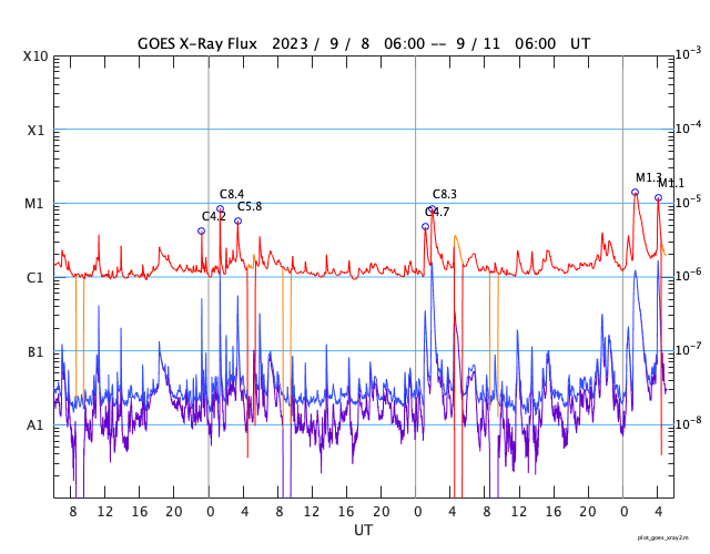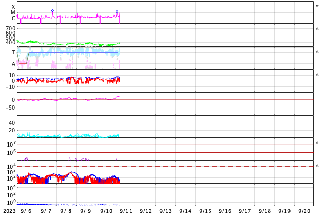 2023/ 9/11 14:17 更新 M1.3、M1.1の中規模フレアが発生しました。太陽風は低速です。 担当 篠原 今朝、11日10時(世界時11日1時)に、 太陽の東端(左端)の北側(上側)の3429黒点群で、 M1.3の中規模フレアが発生しました。 3429群は、昨日のニュースの可視光写真で 新しい黒点として示していた領域ですが、 いきなりMクラスフレアの発生となっています。 SDO衛星AIA131とGOES衛星SUVI 304の動画を掲載します。 フレアとともにコロナの噴出が発生しています。 SOHO衛星LASCO C2、C3を見ると、 太陽の左側に向かってCME(コロナ質量放出)が発生しています。 今回は地球に対して横向きの噴出ですが、 3429群の活動が今後も続くと、 影響が地球へ到来する可能性が次第に高まります。 M1.3フレアに続いて、11日13時(世界時11日4時)には、 太陽の東端(左端)の南側(下側)の3431黒点群で、 M1.1の中規模フレアが発生しています。 掲載したSDO衛星AIA131の動画の最後に、 この輝きが見えています。 2つの領域の活動に注目してください。 SOHO衛星LASCO C2、C3の動画では、 太陽の右上に噴出するCMEも見えています。 太陽のこちら側では特に変化が起きていないので、 向こう側で発生した現象の様です。 太陽風は、350km/秒の状態から、 グラフの後半で380km/秒へ少し上がる変化が見えています。 低速の状態が続いていますが、 この後はどの様に推移するでしょうか 磁場強度は、5nTから8nTに少し上がって、 最後は5nTへ戻っています。 磁場の南北成分は、北寄りの傾向です。 磁気圏は穏やかで、AE指数はほとんど変化がありません。 ![]() 3429黒点群で発生したM1.3と3431群で発生したM1.1の中規模フレア。 (c) SDO衛星AIA131 (NASA)、(動画加工 : 宇宙天気ニュース) ![]() M1.3フレアでのコロナの噴出の様子。 (c) GOES衛星SUVI 304 (NOAA)、(動画加工 : 宇宙天気ニュース) ![]() 右上のCMEは太陽の向こう側の現象。左側のCMEはM1.3フレアによる。 (c) SOHO衛星LASCO C2、C3 (ESA & NASA)、(動画加工 : 宇宙天気ニュース) ![]() SDO衛星のAIA193カメラによる太陽コロナの様子 (c) SDO (NASA) ![]() SDO衛星による太陽の可視光写真。マウスの矢印を写真に重ねると、黒点番号付きの写真に切り替わります。 (c) SDO (NASA) ![]() GOES衛星の太陽X線強度。赤・橙 = 0.1〜0.8 nm、青・紫 = 0.05〜0.4 nm (c) データ:NOAA/SWPC、作図:宇宙天気ニュース ![]() ACEが観測した太陽風の磁場(1番上の枠、白線は全体の強度、赤線は南北成分) および、太陽風の密度(3番目の橙線)、速度(4番目の黄線) (c) NOAA/SWPC ![]() AE指数(速報値) 下段のAEグラフの値が高くなると、オーロラ活動が活発化しています。 (c) 京都大学WDC ![]() ![]() 27日の太陽周期に合わせた図 太陽が同じ面を地球に向けていた27日前の変化から、今後を予想することができます。 (c) 作図:宇宙天気ニュース