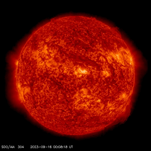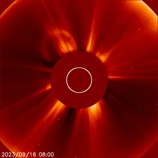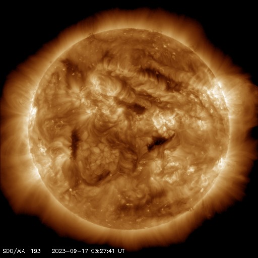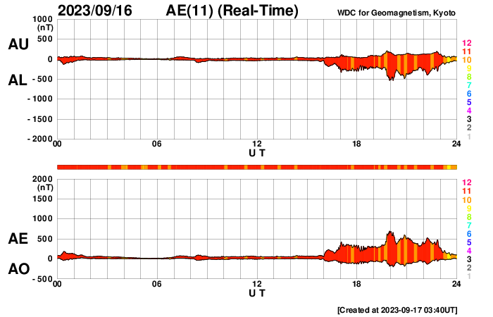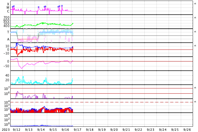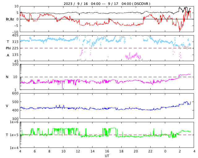 2023/ 9/17 12:53 更新 フィラメント噴出が発生しています。太陽風の弱い乱れが到来しました。 担当 篠原 昨日の午後、16日14時(世界時15日5時)頃に、 太陽の中心部でフィラメント噴出が発生しました。 SDO衛星AIA304の動画を掲載します。 薄暗い筋として見えているダークフィラメントが、 太陽の右側全体に向かって大きく広がっています。 この噴出により、CME(コロナ質量放出)が 太陽の右側を中心に大きく広がっています。 SOHO衛星LASCO C2、C3の動画を見ると、 太陽の左側へも広がっているので、 太陽風の乱れは地球へやって来るのではないでしょうか。 発生から3日くらいかかると考えると、 明後日、19日頃でしょうか。 速度の変化は小幅になりそうですが、 磁場の強まりに注目して下さい。 この時、磁場が南向きに強まると、 磁気圏の活動が激しくなる可能性があります。 太陽は、昨日のニュースの時に発生した M3.3の中規模フレア以降は、 C1〜2の小さいフレアが起きた程度で、穏やかな状態です。 可視光写真の東端(左端)に3435黒点群が現れていますが、 昨日のフレア以降は目立つ活動を起こしていません。 太陽風は、速度は420km/秒、磁場強度は5nTと 平均的な状態が続いていましたが、 17日11時(世界時17日2時)に小規模の変化が到来して、 速度は470km/秒へ、磁場強度は8nTへそれぞれ変化しています。 昨日のニュースなどでお知らせしていた 14日午後のCMEによる変化ではないでしょうか。 変化は小規模なので、影響は限定的になりそうです。 磁気圏の活動は、 太陽風磁場の南北成分が南寄りで推移していたため、 AE指数は500nT程度の小規模の変化が見られています。 グラフの最後で、磁場は北向きになっています。 この状態が続けば、磁気圏は穏やかになるでしょう。 一方、この後南向きに切り替わると、 磁気圏も活動的な状態に戻ります。 ![]() 太陽の中心部で発生したフィラメント噴出。 (c) SDO衛星AIA304、(動画加工 : 宇宙天気ニュース) ![]() CMEは太陽の右寄りに広がっていますが、地球の方向へも向かっている様です。 (c) SOHO衛星LASCO C2、C3 (ESA & NASA)、(動画加工 : 宇宙天気ニュース) ![]() SDO衛星のAIA193カメラによる太陽コロナの様子 (c) SDO (NASA) ![]() SDO衛星による太陽の可視光写真。マウスの矢印を写真に重ねると、黒点番号付きの写真に切り替わります。 (c) SDO (NASA) ![]() GOES衛星の太陽X線強度。赤・橙 = 0.1〜0.8 nm、青・紫 = 0.05〜0.4 nm (c) データ:NOAA/SWPC、作図:宇宙天気ニュース ![]() DSCOVRが観測した太陽風の磁場(黒線は全体の強度、赤線は南北成分) 磁場の向き、プラズマの密度、速度、温度 (c) データ:NOAA/SWPC、作図:宇宙天気ニュース ![]() AE指数(速報値) 下段のAEグラフの値が高くなると、オーロラ活動が活発化しています。 (c) 京都大学WDC ![]() ![]() 27日の太陽周期に合わせた図 太陽が同じ面を地球に向けていた27日前の変化から、今後を予想することができます。 (c) 作図:宇宙天気ニュース