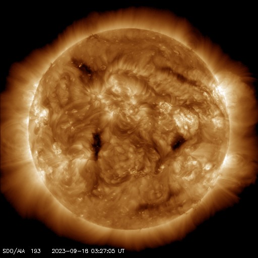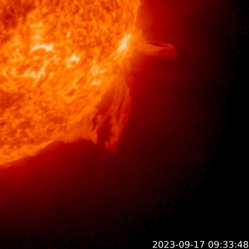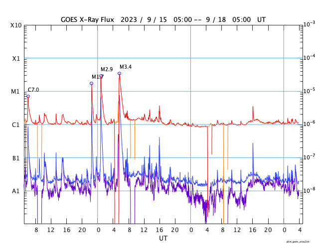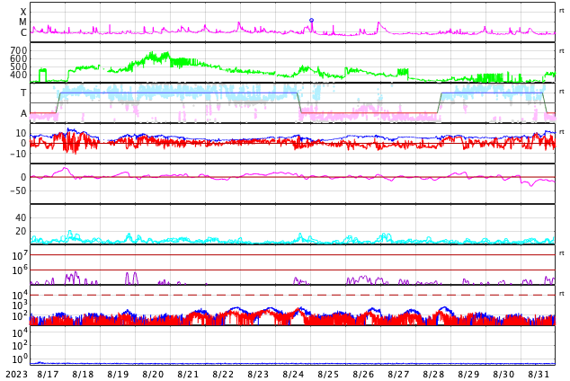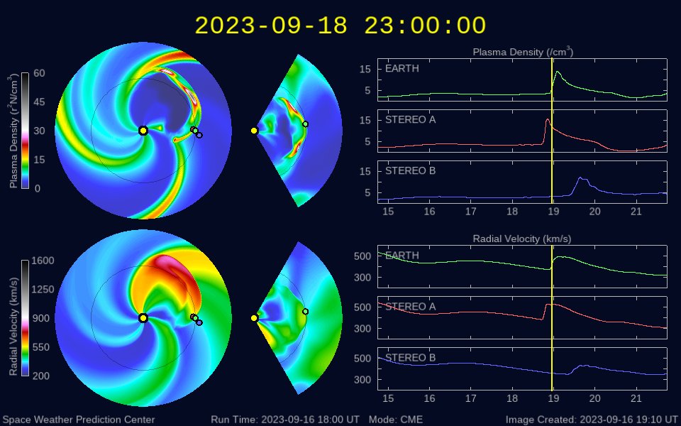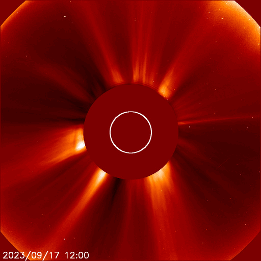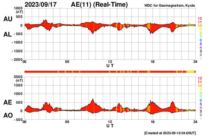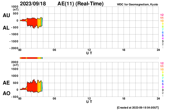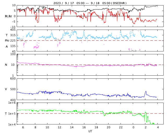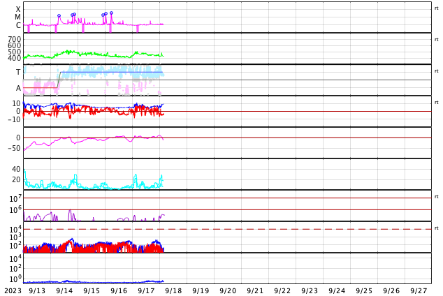 2023/ 9/18 13:15 更新 CMEによる太陽風の乱れが近付いています。太陽風は平均的な速度です。 担当 篠原 昨日紹介した16日午後のCME(コロナ質量放出)による太陽風の乱れは、 明日の朝、19日8時(世界時18日23時)頃に到来する可能性があると NOAA/SWPCの予報で発表されています。 予報の図を見ると、 飛び出したガスの端が地球に当たる様です。 太陽風の変化は比較的小規模になりそうです。 太陽は、東端(左端)の3435黒点群で C3.5の小規模フレアが発生しただけで、 X線グラフは変化が少なくなっています。 一方、GOES衛星SUVI 304を見ると、 昨夜、17日20時(世界時17日11時)頃に、 南西の端(右下)でプロミネンス噴出が発生しています。 SOHO衛星LASCO C2、C3では、 CMEが太陽の右下に向かって飛び出しています。 地球に対して横向きの噴出なので影響はありません。 太陽風は、速度が470km/秒から420km/秒へ 少し下がっていますが、平均的な状態です。 磁場強度は、5〜7nTで推移していましたが、 グラフの最後で10nTに強まっています。 このまま強まった状態が続くのか、 一時的な変化で、再び下がるのか、 しばらく注目してください。 磁場の南北成分は、 北寄りから次第に南寄りに変化しています。 AE指数は、中規模の変化が時間をおいて発生していましたが、 最後は変化がしばらく続きそうになっています。 太陽風磁場の南北成分がどの様に推移するか、 注目してください。