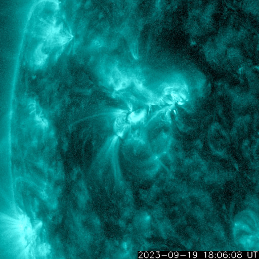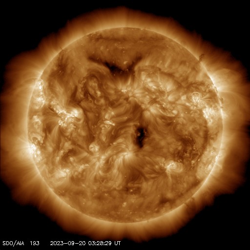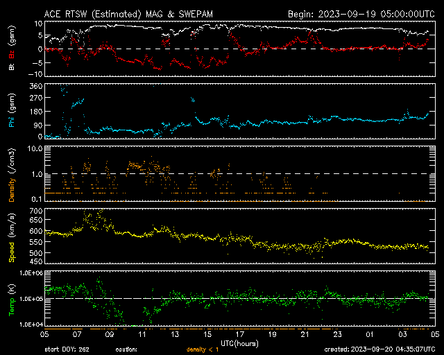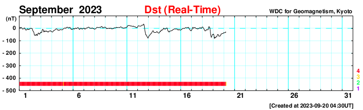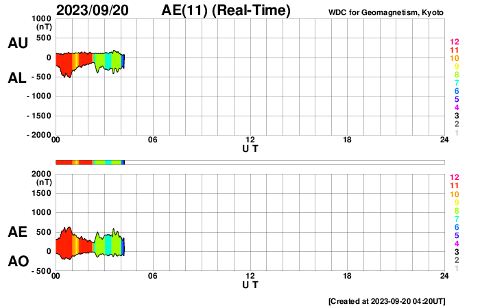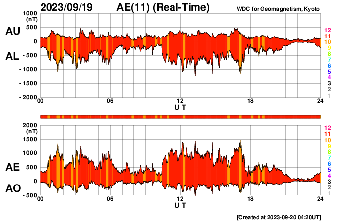 2023/ 9/20 13:31 更新 太陽風磁場が南向きになり、磁気圏の活動が強まりました。イエローナイフのオーロラをどうぞ。 担当 篠原 昨日紹介しました景山植光さんによる カナダ・イエローナイフのオーロラ写真の続きです。 次の夜、現地18日0時の撮影で、 ブレークアップを捉えたとのことです。 ただ、久しぶりの撮影だったため、 この瞬間しか撮影することができず残念だったとのことです。 オーロラの動きの速さが2枚の写真から感じられます。 きれいな写真をどうもありがとうございました。 昨日お知らせした太陽風の乱れは、 夜にかけてもう一段強まっています。 昨夕、19日17時(世界時8時)に 磁場強度が8nTへ少し強まったのですが、 その頃から磁場の南北成分が南向きに変化するようになり、 -5nT前後の状態が7時間ほど続きました。 速度は570km/秒と高まった状態で、 これらの影響で磁気圏の活動が活発になり、 AE指数は、1000〜1500nTの大きい変化が こちらも7時間ほど続きました。 極域では素晴らしいオーロラが 輝いていたのではないでしょうか。 太陽風の乱れの到来以降、Dst指数も下がっていて、 速報値ですが、最大で-82nTまで下がっています。 (Dst指数はマイナス方向に強まります) 中規模の磁気嵐が発生しています。 今日に入った頃、20日1時(世界時19日16時)くらいで 磁場の南向きの変化は終わっていて、 以降は、0nT付近で変化する様になっています。 速度は520km/秒と高まった状態が続いていますが、 磁気圏の活動は下がって、 AE指数は、0〜500nTの小規模の変化が 見られる程度になっています。 太陽は、東側(左側)の3435黒点群の活動が続き、 昨夕、19日18時半(世界時19日9時半)にM1.8、 今朝、20日5時(世界時19日20時)にM4.0と、 中規模フレアが2回発生しています。 M4.0のフレアとそれに続くC9.7の小規模フレアの様子を、 SDO衛星AIA131の動画で紹介します。 また、北西(右上)の3436群でも、 C5.0、C4.2、C2.7などの小規模フレアが発生しています。