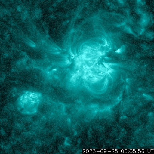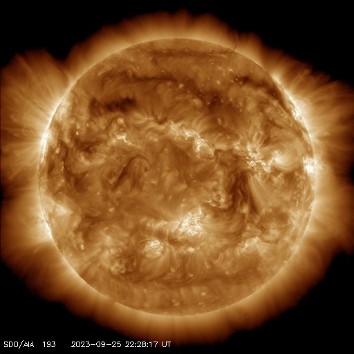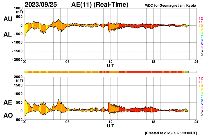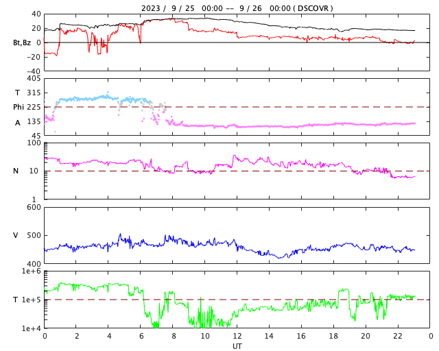 2023/ 9/26 08:17 更新 太陽風の乱れは終わりに近づいています。磁気圏は穏やかになっています。 担当 篠原 昨日の朝に到来した太陽風の乱れは、 その後、磁場強度がさらに上昇して、 25日19時(世界時25日1時)頃に34nTに達しました。 以降はゆっくりと下がっていますが、 現在も17nTと強まった状態です。 一方、磁場の南北成分は、 25日10時(世界時25日1時)以降は 北向きで推移する様になっています。 磁気圏の活動もこれ以降は弱まって、 AE指数は、25日のグラフに入ると 500nTの中規模の変化が見られる程度になり、 グラフの最後は変化がなくなっています。 太陽風の速度は、 450km/秒前後と平均的な状態で推移しています。 この後、磁場強度はゆっくりと下がって、 太陽風は穏やかな状態に戻るでしょう。 太陽は、中心部の南側(下側)の3445黒点群と その左側の領域で連続するようにフレアが発生して、 X線強度としてはC9.9と Mクラス寸前の小規模フレアになっています。 この左側の領域は、黒点が昨日よりも大きくなっています。 ![]() 太陽の南側で発生したC9.9の小規模フレア。 (c) SDO衛星AIA131 (NASA)、(動画加工 : 宇宙天気ニュース) ![]() SDO衛星のAIA193カメラによる太陽コロナの様子 (c) SDO (NASA) ![]() SDO衛星による太陽の可視光写真。マウスの矢印を写真に重ねると、黒点番号付きの写真に切り替わります。 (c) SDO (NASA) ![]() DSCOVRが観測した太陽風の磁場(黒線は全体の強度、赤線は南北成分) 磁場の向き、プラズマの密度、速度、温度 (c) データ:NOAA/SWPC、作図:宇宙天気ニュース ![]() AE指数(速報値) 下段のAEグラフの値が高くなると、オーロラ活動が活発化しています。 (c) 京都大学WDC ![]() ![]() 27日の太陽周期に合わせた図 太陽が同じ面を地球に向けていた27日前の変化から、今後を予想することができます。 (c) 作図:宇宙天気ニュース