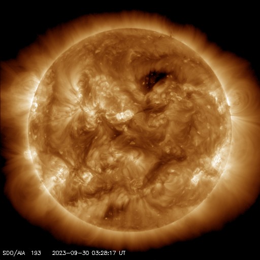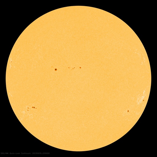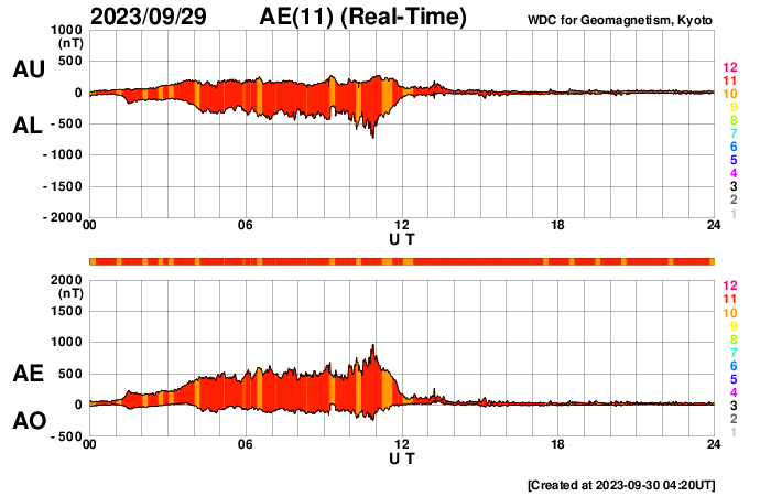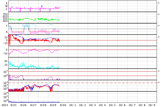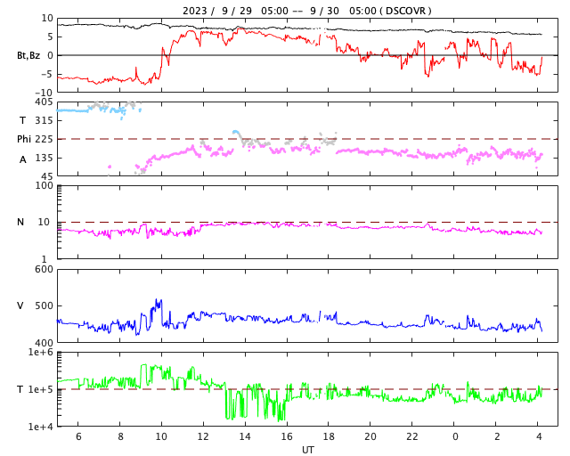 2023/ 9/30 13:21 更新 太陽風は平均的な状態です。現在の磁気圏は穏やかです。 担当 篠原 太陽風の速度は、450km/秒と平均的な状態で安定しています。 磁場強度は、8nTから6nTへ少し下がり、 こちらも平均的な状態になっています。 磁場の南北成分は、 昨日のニュースの後も南向きの傾向が続き、 -7nTに達する変化が8時間程続きました。 このため磁気圏の活動はやや強まり、 AE指数は500nTの中規模の変化が連続して発生しています。 その後、磁場は北向きに切り替わり、 磁気圏は穏やかになりました。 現在は0nT付近で南北に細かく変化しています。 磁気圏は穏やかです。 太陽は、北東の端(左上)の向こう側でC7.5、 その隣の黒点群でC5.0などの小規模フレアが発生しています。 この後、北東の端から黒点が現れそうです。 どの様な領域でしょうか。