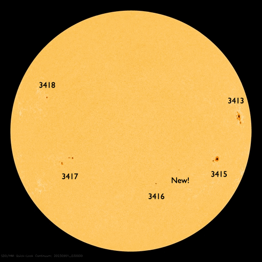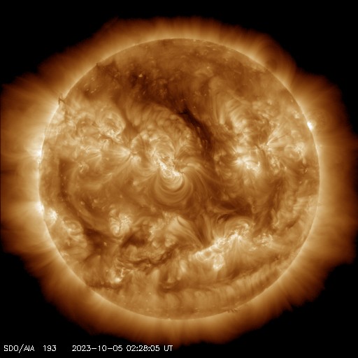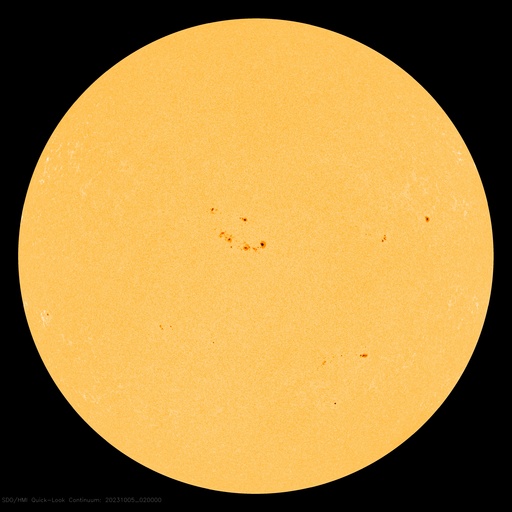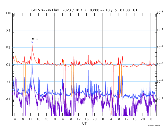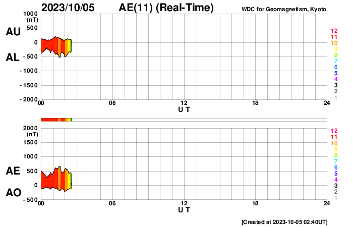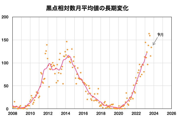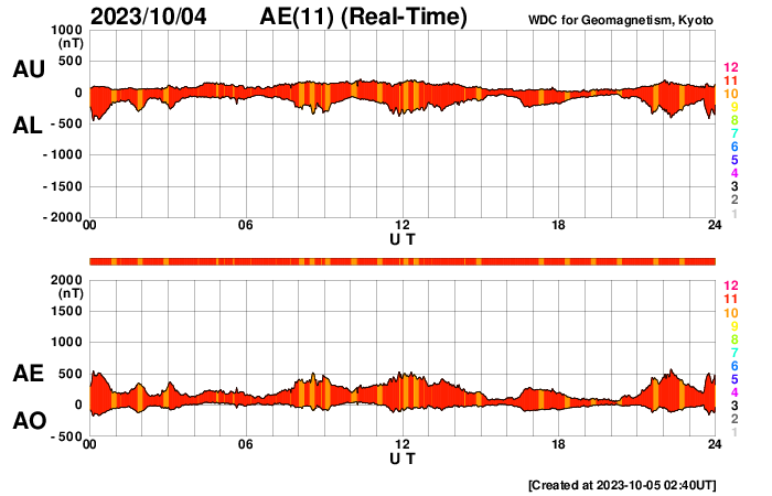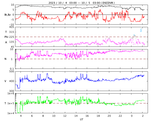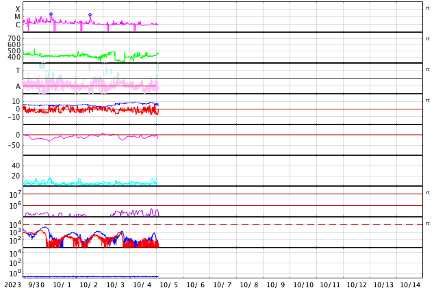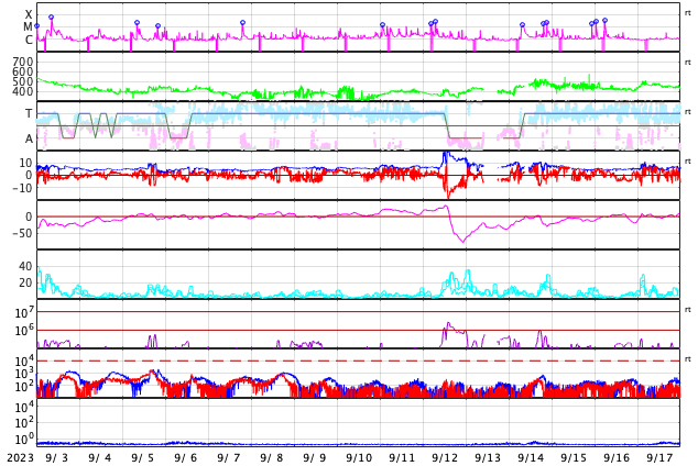 2023/10/ 5 11:43 更新 太陽風磁場の南寄りの変化が続いています。9月の黒点相対数は 133.6 でした。 担当 篠原 WDC-SILSOより、9月の黒点相対数は 133.6 と発表されました。 8月の114.9からは上がりましたが、 6〜7月の150を超える高まりまでは戻らず、 今期はこのくらいの高さで推移することになるのかもしれません。 1か月間の動画を見ると、 9月は黒点が安定して現れ続けていた印象です。 黒点相対数の1日値が2桁に下がったのは、 8月は8日ありましたが、9月は5日に減りました。 この差も月平均値が上がったことに繋がっているのでしょう。 現在の太陽は、活動が少なくなっていて、 中心部南西側(右下)の3450黒点群でC2.5、 中心部の3452群でC2.0、 西側(右側)の3453群でC3.0など、 小さめの小規模フレアが起きた程度です。 X線グラフは変化が少なくなっています。 太陽風は、速度がグラフの最後で 450km/秒へ少し上がっています。 この後も変化が続くでしょうか。 しばらく注目してください。 磁場強度は、7〜8nTと少し強めの状態が続き、 南北成分は南寄りで、 -5nT程度の南向きの強まりが度々発生しています。 このため、磁気圏の活動も少し高まった状態が続き、 オーロラの活動度を示すAE指数のグラフは、 500nTに達するくらいの変化が繰り返し発生しています。 ただし、太陽風のグラフの最後では、 磁場強度が5nTに少し下がっています。 この状態が続くと、南向きの変化も少し小さくなるので、 磁気圏の活動は弱くなるかもしれません。