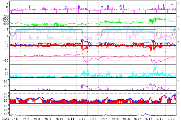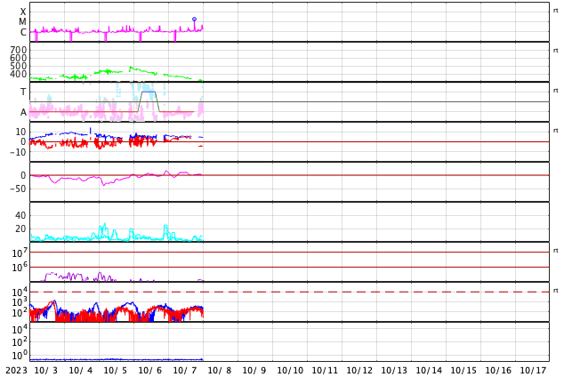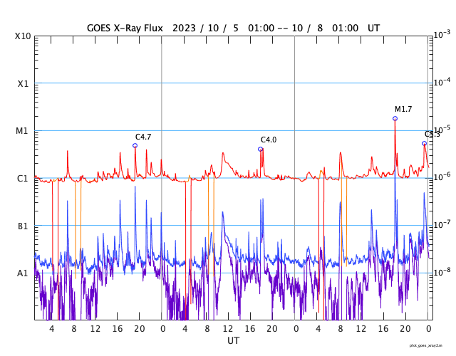 GOES衛星の太陽X線強度。赤・橙 = 0.1〜0.8 nm、青・紫 = 0.05〜0.4 nm (c) データ:NOAA/SWPC、作図:宇宙天気ニュース ![]() | ||||||||||||||||||||||||||||||||||||||||||||||||||||||||||||||||||||||||||||||||||||||||||||||||||||||||||||||||||||||||||||||||||||||||||||||||||||||||||||||||||||||||||||||||||||||||||||||||||||||||||||||||||||||||||||||||||||||||||||||||||||||||||||||||||||||||||||||||||||