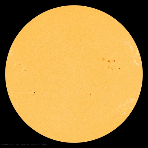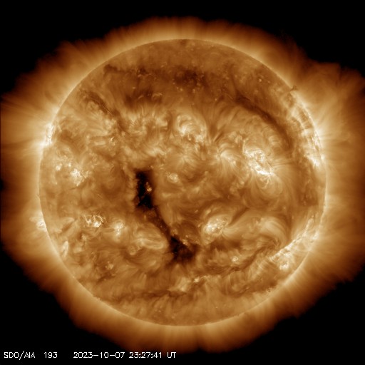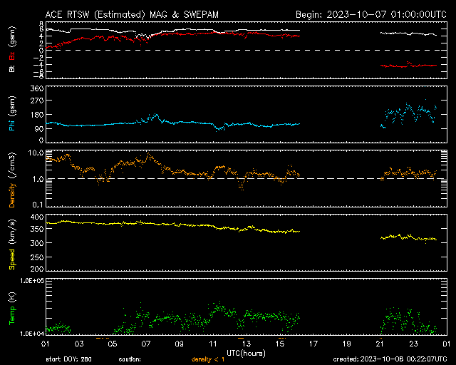 2023/10/ 8 09:21 更新 太陽風はさらに低速になり、磁気圏も穏やかです。 担当 篠原 太陽風の速度は、 370km/秒から310km/秒へゆっくりと低下して、 さらに低速になっています。 磁場強度は、4〜5nTと平均的な状態です。 磁場の南北成分を見ると、 中盤までは+4〜5nTの北向きが続いていますが、 後半の途中で南向きに切り替わり、 今度は -4〜 -5nT程度の南向きが続く様になっています。 速度がだいぶ下がっているため 磁気圏への影響は小さく、 AE指数は、最後の部分で小規模の変化が発生しているだけです。 SDO衛星AIA193を見ると、 縦に伸びるコロナホールが太陽の中心部に達しています。 この領域の影響で、 3〜4日後くらいに太陽風の速度が高まる可能性があります。 横の広がりが小さいので、 到来しても比較的短い時間の変化になりそうです。 太陽は、南東(左下)の3460黒点群で、 今日未明、8日3時(世界時7日18時)にM1.7の中規模フレア。 そして、グラフの最後の8日8時半(世界時7日23時半)に 北西(右上)の3452群でC5.3の小規模フレアが発生しています。 3460群は新しく発生した黒点です。 この後も発達が続くか、注目して下さい。