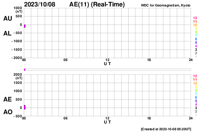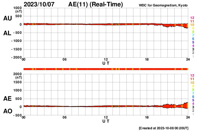 (c) SDO (NASA) ![]() SDO衛星による太陽の可視光写真。マウスの矢印を写真に重ねると、黒点番号付きの写真に切り替わります。 (c) SDO (NASA) ![]() ACEが観測した太陽風の磁場(1番上の枠、白線は全体の強度、赤線は南北成分) および、太陽風の密度(3番目の橙線)、速度(4番目の黄線) (c) NOAA/SWPC ![]() AE指数(速報値) 下段のAEグラフの値が高くなると、オーロラ活動が活発化しています。 (c) 京都大学WDC ![]() ![]() 27日の太陽周期に合わせた図 太陽が同じ面を地球に向けていた27日前の変化から、今後を予想することができます。 (c) 作図:宇宙天気ニュース