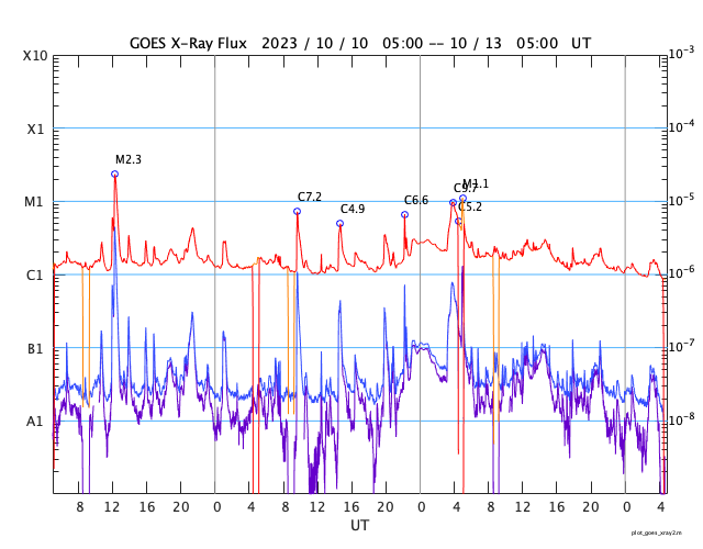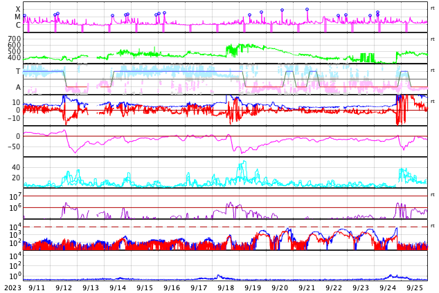 GOES衛星の太陽X線強度。赤・橙 = 0.1〜0.8 nm、青・紫 = 0.05〜0.4 nm (c) データ:NOAA/SWPC、作図:宇宙天気ニュース ![]() | ||||||||||||||||||||||||||||||||||||||||||||||||||||||||||||||||||||||||||||||||||||||||||||||||||||||||||||||||||||||||||||||||||||||||||||||||||||||||||||||||||||||||||||||||||||||||||||||||||||||||||||||||||||||||||||||||||||||||||||||||||||||||||||||||||||