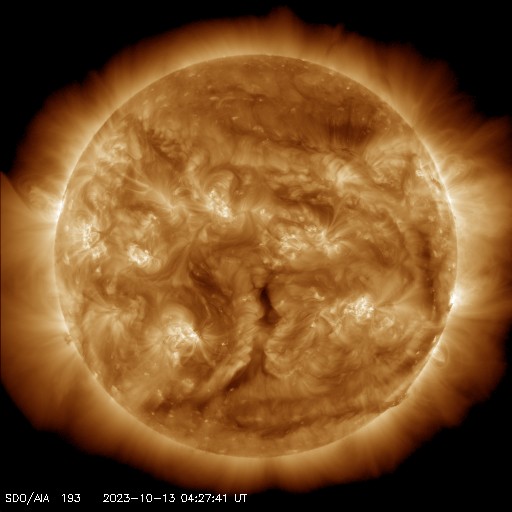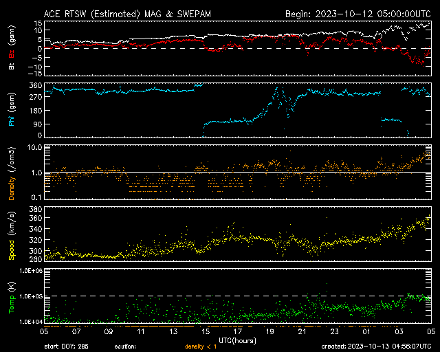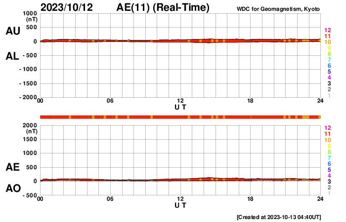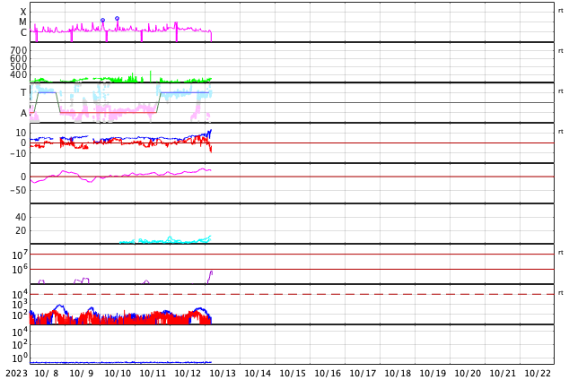 2023/10/13 13:58 更新 太陽風は低速の状態が続き、磁気圏も穏やかに推移しています。 担当 篠原 太陽風は、300km/秒から350km/秒へ 少し速度が上がっていますが、 低速の状態が続いています。 磁場強度は4nTから少しずつ強まり、 グラフの最後では13nTに達しています。 SDO衛星AIA193で注目していたコロナホールは 太陽の西の端に達しています。 速度の高まりは来ないままでした。 太陽風磁場の南北成分は北寄りの傾向が続き、 速度が下がっていることもあって、 磁気圏はとても穏やかです。 AE指数は変化が見られない状態です。 一方、太陽風のグラフの最後で磁場が南向きに強まっています。 この傾向が続くと、低速の状態は続いていますが、 磁気圏の活動は少し強まるかもしれません。 太陽は、昨日の昼、12日12時(世界時12日3時)に、 中心部南西側(右下)の3460黒点群でC9.7の小規模フレア、 直後に北西の端の3451群でM1.1のフレアが発生しています。 これ以降、X線グラフは目立った変化がなく、 太陽は穏やかになっています。