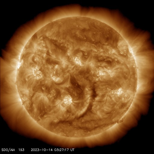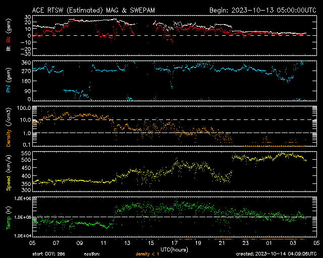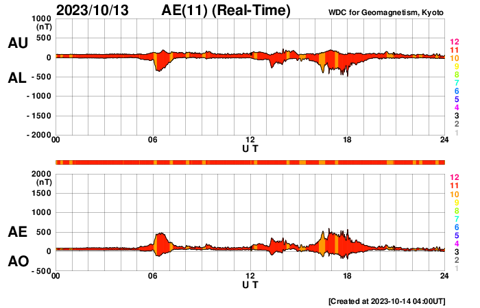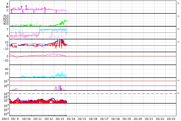 2023/10/14 13:10 更新 太陽風は高速になっています。磁気圏は穏やかです。 担当 篠原 昨日のニュースの頃に始まっていた太陽風磁場の強まりは、 夕方にかけてさらに強まり、 ACE衛星では13日17時(世界時13日8時)頃に 20nTを超えるほどになりました。 この状態が4時間ほど続いて、その後、磁場は次第に弱まり、 現在は2nTと弱い状態まで下がっています。 一方、350km/秒と低速だった太陽風の速度は、 20nTに達した磁場が弱まり始めた頃から上昇を始め、 今朝、14日7時(世界時13日22時)に500km/秒台まで上がって、 高速の状態に達しています。 現在は520km/秒付近です。 SDO衛星AIA193では、 コロナホールは西の端まで進んでしまいましたが、 この領域の影響が遅めでやって来たのでしょうか。 2〜4日前くらいの太陽では、目立った変化は発生していないので、 CME(コロナ質量放出)に関係する速度の高まりではないように思います。 この後、速度の高まりがどのくらい続くでしょうか。 注目して下さい。 太陽風磁場の南北成分は、 主に北向きで推移していて、 一時的な南向きの変化が時々発生しています。 このため磁気圏は基本的には穏やかで、 AE指数は、500nTの変化が一時的に発生する程度です。 太陽は、C1台の小さいフレアが発生する程度で、 穏やかな状態で推移しています。 X線グラフは、全体の強度も次第に下がっています。