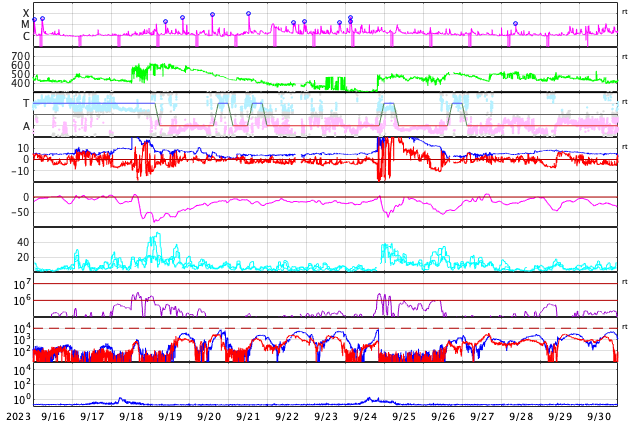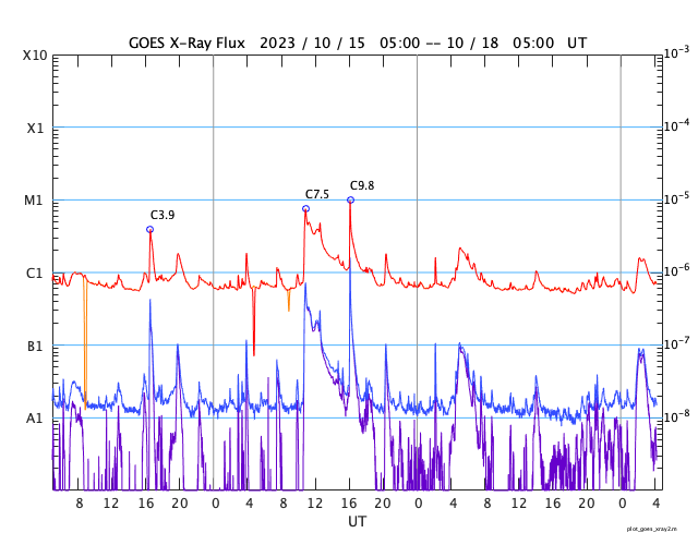 GOES衛星の太陽X線強度。赤・橙 = 0.1〜0.8 nm、青・紫 = 0.05〜0.4 nm
