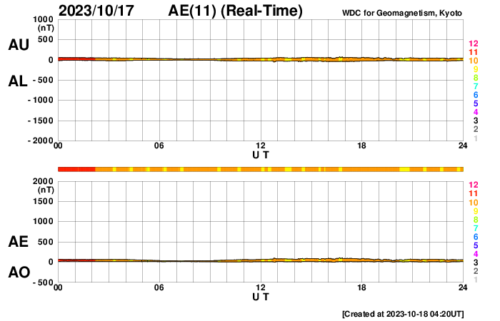 下段のAEグラフの値が高くなると、オーロラ活動が活発化しています。