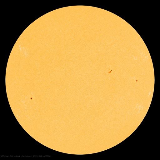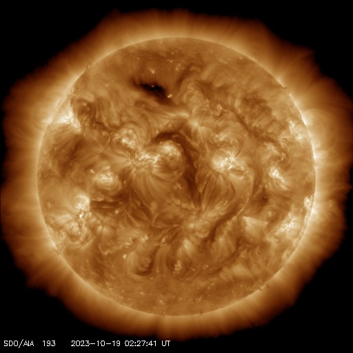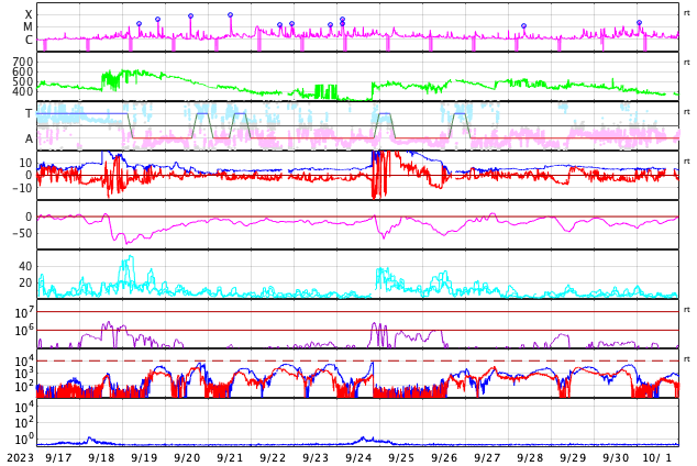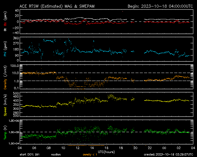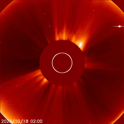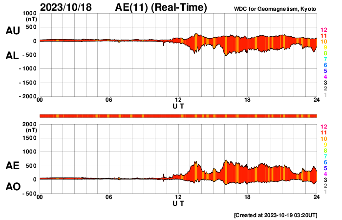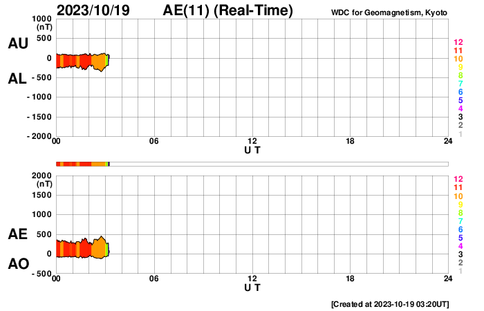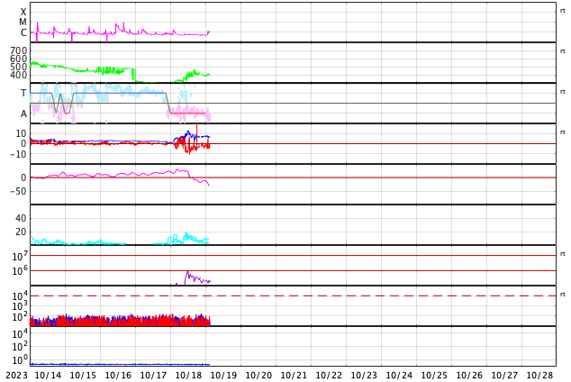 2023/10/19 12:30 更新 太陽風は平均的な速度に上がっています。磁気圏はやや活動的になっています。 担当 篠原 昨日の夕方から太陽風の速度が一段上昇して、 400km/秒と平均的な速さになりました。 現在もこの状態です。 磁場強度も速度が高まる頃に10nT程度に強まり、 以降はゆっくりと低下していますが、 現在も7nTと少し強めの状態です。 磁場の南北成分は、 磁場が強まった頃から南向きで推移する様になり、 初めの頃は、-7nT程度の南向きがしばらく続いています。 このため、磁気圏の活動はやや強まり、 AE指数は500nTを超えるくらいの 中規模の変化がしばらく続いています。 その後は、南向きの変化がやや小さくなり、 AE指数の変化も300nTくらいに下がっています。 太陽は、X線グラフの変化がほとんどなく、 こちら側は穏やかです。 一方、向こう側ではある程度の規模の活動が発生した様で、 昨日、18日11時半(世界時18日2時半)頃に、 太陽の右上に広がるCME(コロナ質量放出)が発生しています。 SOHO衛星LASCO C2、C3の動画を掲載します。