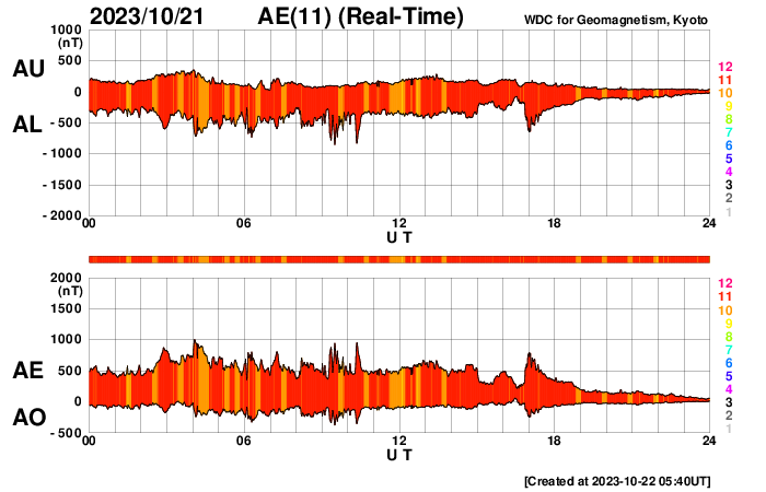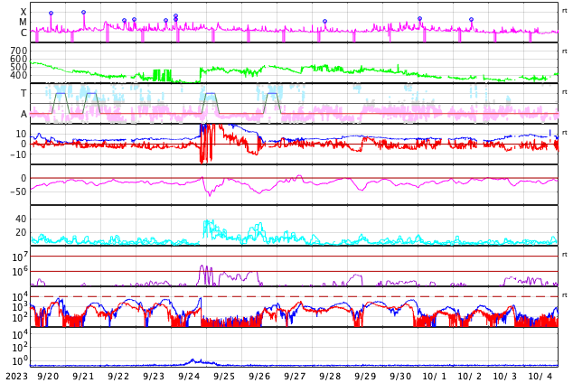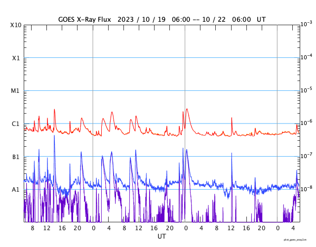 GOES衛星の太陽X線強度。赤・橙 = 0.1〜0.8 nm、青・紫 = 0.05〜0.4 nm (c) データ:NOAA/SWPC、作図:宇宙天気ニュース ![]() | ||||||||||||||||||||||||||||||||||||||||||||||||||||||||||||||||||||||||||||||||||||||||||||||||||||||||||||||||||||||||||||||||||||||||||||||||||||||||||||||||||||||||||||||||||||||||||||||||||||||||||||||||||||||||||||||||||||||||||