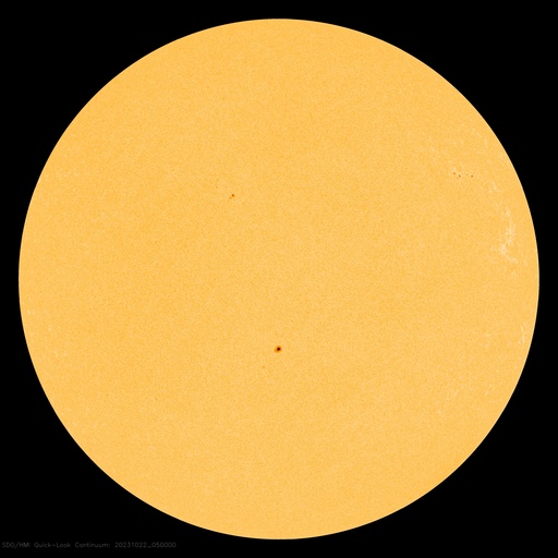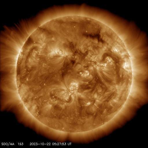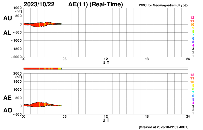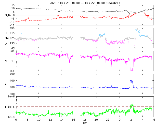 2023/10/22 14:59 更新 低速の太陽風が続いています。南向き磁場により磁気圏の活動が高まりました。 担当 篠原 太陽風の速度は、300km/秒と低速の状態が続いています。 10nTに強まっていた磁場強度は、 昨夜以降ゆっくりと下がって、 今日の昼頃に3nTまで弱まりました。 その後少し上がって、現在は7nTと平均的な状態です。 磁場の南北成分は、南向きの状態が今日の昼まで続き、 AE指数は、500〜800nT程度の中規模の変化が 今日未明にかけて続きました。 その後は変化が小さくなっていますが、 太陽風のグラフの最後で、 磁場が再び南向きに強まっているので、 この傾向が続くと、 磁気圏の活動も少し高まりそうです。 太陽のX線グラフは、 C1.5の小規模フレアが発生しただけで、 その他は穏やかな状態が続いています。 可視光写真は黒点が目立たなくなっています。 ![]() SDO衛星のAIA193カメラによる太陽コロナの様子 (c) SDO (NASA) ![]() SDO衛星による太陽の可視光写真。マウスの矢印を写真に重ねると、黒点番号付きの写真に切り替わります。 (c) SDO (NASA) ![]() DSCOVRが観測した太陽風の磁場(黒線は全体の強度、赤線は南北成分) 磁場の向き、プラズマの密度、速度、温度 (c) データ:NOAA/SWPC、作図:宇宙天気ニュース ![]() AE指数(速報値) 下段のAEグラフの値が高くなると、オーロラ活動が活発化しています。 (c) 京都大学WDC ![]() ![]() 27日の太陽周期に合わせた図 太陽が同じ面を地球に向けていた27日前の変化から、今後を予想することができます。 (c) 作図:宇宙天気ニュース