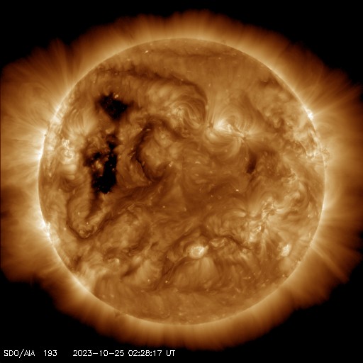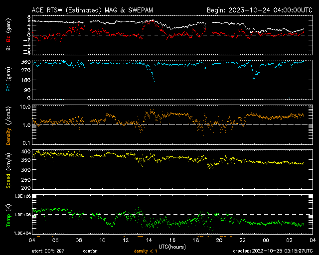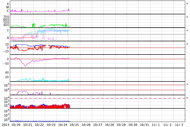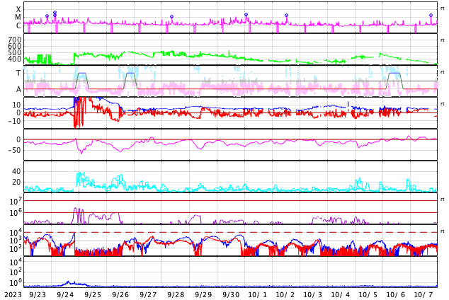 2023/10/25 12:16 更新 太陽風は低速の状態が続き、磁気圏も穏やかです。太陽も概ね静穏です。 担当 篠原 太陽風は低速の状態が続いています。 速度は、370km/秒から330km/秒へ下がっています。 磁場強度も5nTから3nTへ少し下がり、 やや弱くなっています。 磁場の南北成分は、0nT付近か弱い北寄りです。 低速でもあるため磁気圏は穏やかで、 AE指数は変化の見られない状態が続いています。 SDO衛星AIA193では、 東側(左側)に縦に伸びるコロナホールが見えています。 6日後くらいになりそうですが、 この領域の影響に注目してください。 太陽は、東端近くの2つの領域で、 C4.2とC2.6の小規模フレアが連続するように発生しています。 X線のグラフでは、高まりが重なる様に見えています。 その他は目立つ変化はなく、黒点も少ないままです。