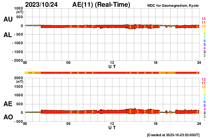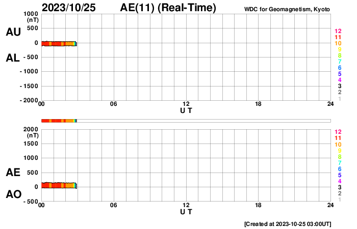 (c) SDO (NASA) ![]() SDO衛星による太陽の可視光写真。マウスの矢印を写真に重ねると、黒点番号付きの写真に切り替わります。 (c) SDO (NASA) ![]() ACEが観測した太陽風の磁場(1番上の枠、白線は全体の強度、赤線は南北成分) および、太陽風の密度(3番目の橙線)、速度(4番目の黄線) (c) NOAA/SWPC ![]() AE指数(速報値) 下段のAEグラフの値が高くなると、オーロラ活動が活発化しています。 (c) 京都大学WDC ![]() ![]() 27日の太陽周期に合わせた図 太陽が同じ面を地球に向けていた27日前の変化から、今後を予想することができます。 (c) 作図:宇宙天気ニュース