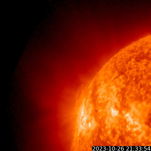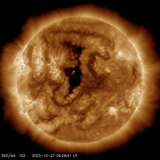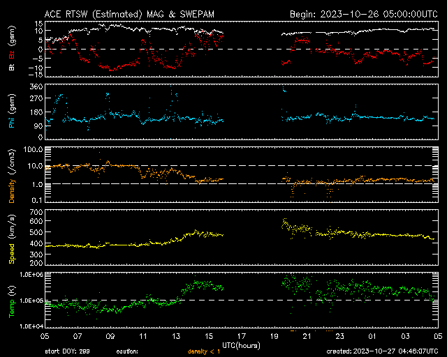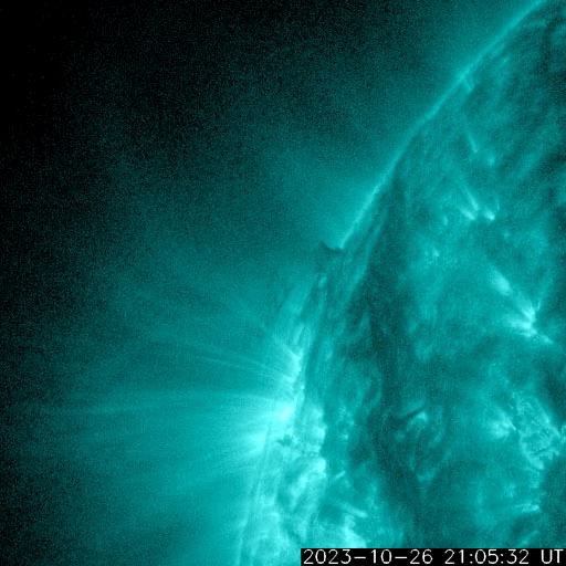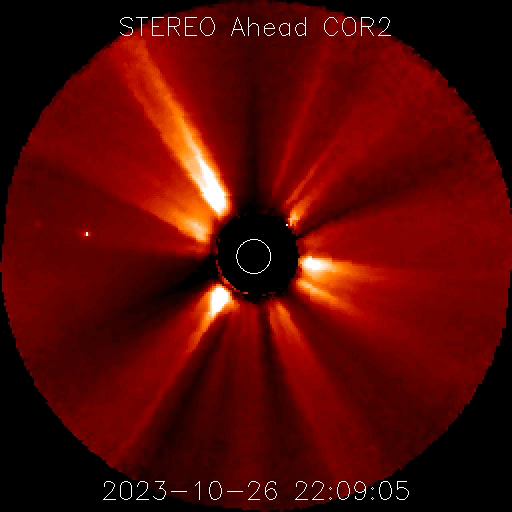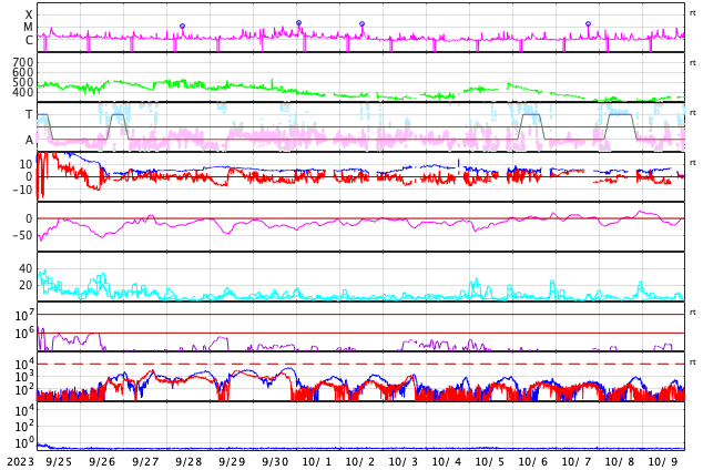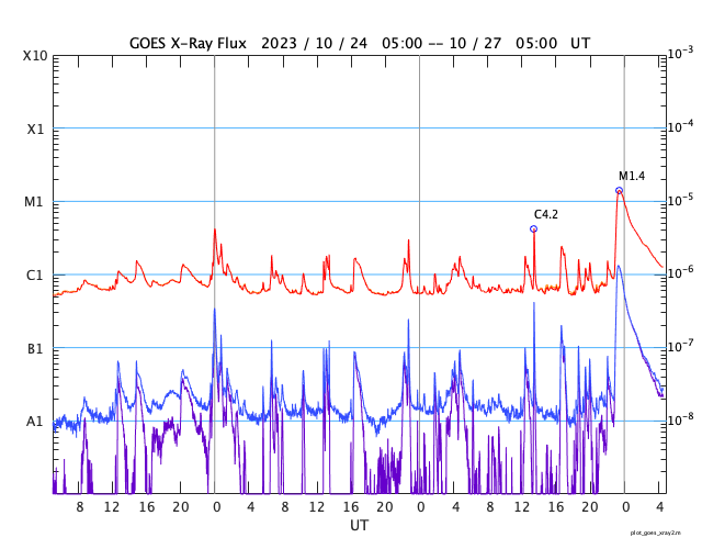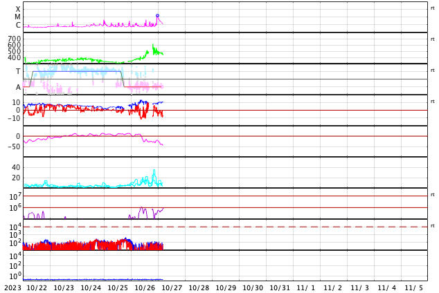 2023/10/27 13:47 更新 M1.4の中規模フレアが発生しました。磁気圏の活動が強まっています。 担当 篠原 今朝、27日8時(世界時26日23時)に、 太陽の北東の端(左上)の3473黒点群で、 M1.4の中規模フレアが発生しました。 Mクラスのフレアの発生は、 10月12日のM1.1以来、2週間ぶりとなり、 ちょっと久しぶりという印象です。 SDO衛星AIA131とGOES衛星SUVI 304 の動画を掲載します。 プロミネンスの光の筋が飛び出す様子が良く見えています。 STEREO Ahead衛星COR2では、 CME(コロナ質量放出)が太陽の左上を中心に広がっています。 ガスの広がりは太陽にかかるくらいまで広がっている様です。 このため、噴出の端の領域が地球へやって来るかもしれません。 到来まで3日程度と考えると、 30日頃の変化に注目してください。 太陽風は、昨夜から速度が400km/秒を超えて高まり、 未明には500km/秒程度の高速風になりました。 その後少し低下して、 現在は460km/秒と平均的な状態に戻りかけています。 磁場強度は、10nT付近と強まった状態になっています。 磁場の南北成分は、-10nTという強い南向きが発生しています。 このため、磁気圏の活動も強まって、 AE指数は1000Tに達する大きい変化が発生しています。 活動の強まりはこの後も見られそうです。 SDO衛星AIA193では、 コロナホールが太陽の中心線に達しています。 3日後の30日頃から太陽風の速度の高まりが始まりそうです。 今日のCMEによる乱れが重なると、 より大きい変化になるかもしれません。 注目してください。 ![]() 太陽の北東の端近くで発生したM1.4の中規模フレア。 (c) SDO衛星AIA131 (NASA)、(動画加工 : 宇宙天気ニュース) ![]() プロミネンスの噴出が見えています。 (c) GOES衛星SUVI 304 (NOAA)、(動画加工 : 宇宙天気ニュース) ![]() 太陽の左上を中心にCMEが発生しています。影響は地球へやって来るかもしれません。 (c) STEREO Ahead衛星COR2 (NASA)、(動画加工 : 宇宙天気ニュース) ![]() SDO衛星のAIA193カメラによる太陽コロナの様子 (c) SDO (NASA) ![]() SDO衛星による太陽の可視光写真。マウスの矢印を写真に重ねると、黒点番号付きの写真に切り替わります。 (c) SDO (NASA) ![]() GOES衛星の太陽X線強度。赤・橙 = 0.1〜0.8 nm、青・紫 = 0.05〜0.4 nm (c) データ:NOAA/SWPC、作図:宇宙天気ニュース ![]() ACEが観測した太陽風の磁場(1番上の枠、白線は全体の強度、赤線は南北成分) および、太陽風の密度(3番目の橙線)、速度(4番目の黄線) (c) NOAA/SWPC ![]() AE指数(速報値) 下段のAEグラフの値が高くなると、オーロラ活動が活発化しています。 (c) 京都大学WDC ![]() ![]() 27日の太陽周期に合わせた図 太陽が同じ面を地球に向けていた27日前の変化から、今後を予想することができます。 (c) 作図:宇宙天気ニュース
