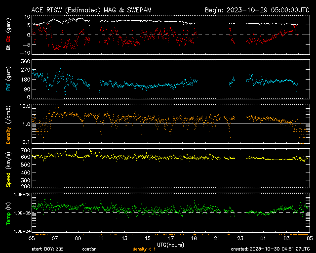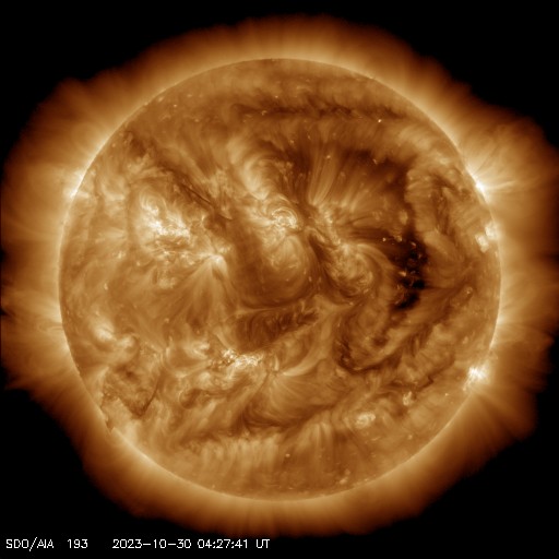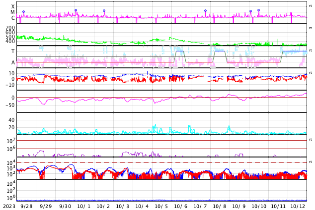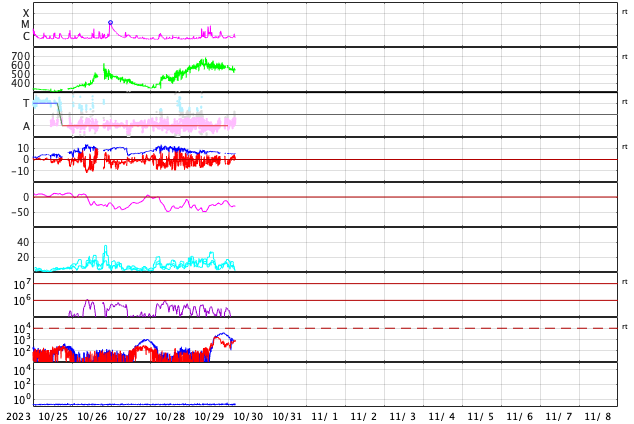 2023/10/30 13:51 更新 高速の太陽風が続き、磁気圏も活動的な状態が続いています。 担当 篠原 太陽風の速度は、昨日のニュースの後に600km/秒へ高まり、 今日に入った頃から少しずつ低下して、 現在は560km/秒です。 高速の状態は続いています。 磁場強度は、7nTから5nTへ少し下がっていますが、 平均的な状態です。 磁場の南北成分は、 グラフの後半に入る頃までは南寄りの状態が続いています。 磁気圏の活動は強まった状態が続き、 AE指数は、500〜1000nTの中規模の変化が 繰り返し発生しています。 ただし、太陽風のグラフの最後で磁場は北向きに変わっています。 この傾向が続くと、この後の磁気圏は穏やかになるでしょう。 どの様に推移するでしょうか。 SDO衛星AIA193では、 コロナホールは太陽の西側(右側)にだいぶ進んでいます。 太陽風速度の高まりは、どこまで続くでしょうか。 太陽は、昨日の午後から、 中心部南側(下側)の3474黒点群の活動度が高まり、 C6.6、C7.8などを含めて、 Cクラスの小規模フレアが10回近く発生しています。 X線グラフを見ると今朝以降は変化がなくなっていますが、 この後はどうなるでしょうか。