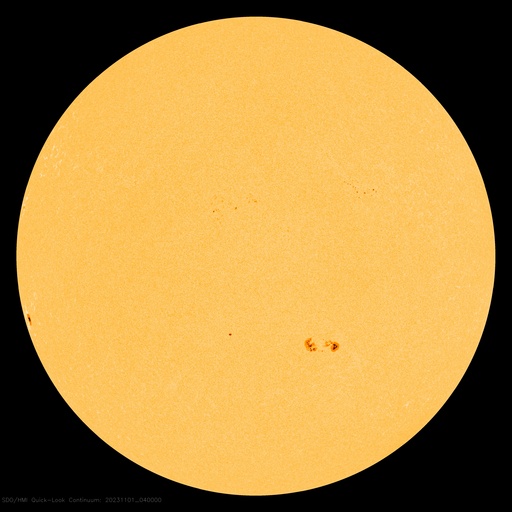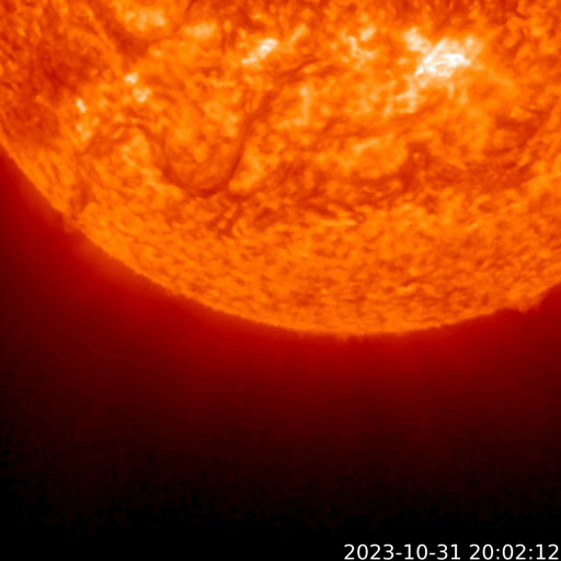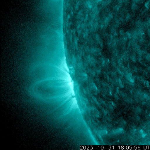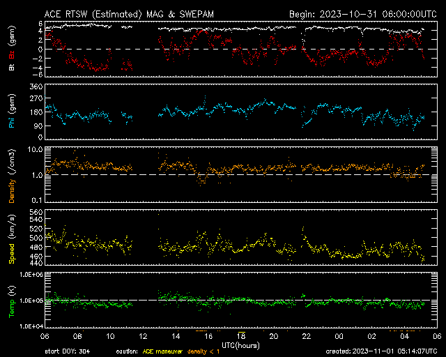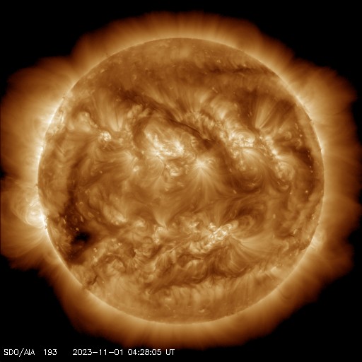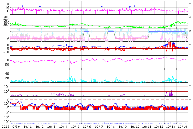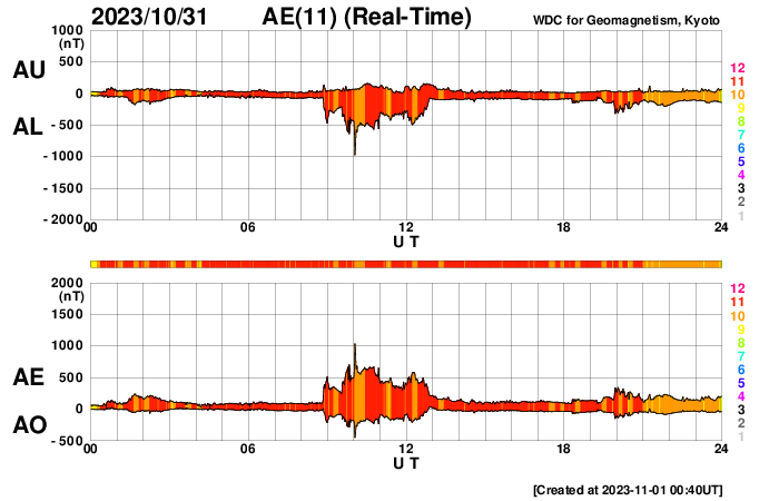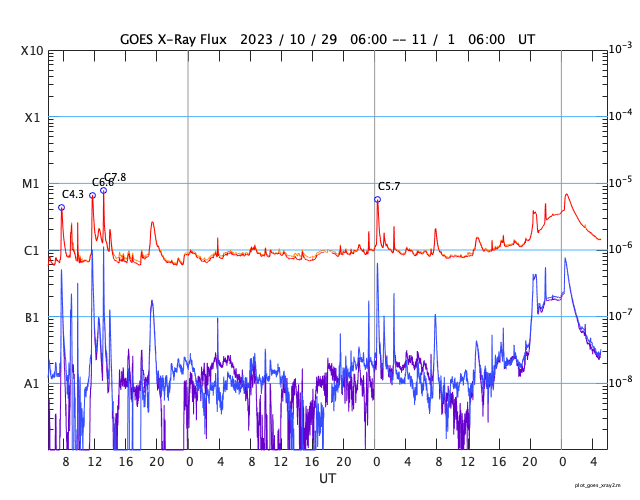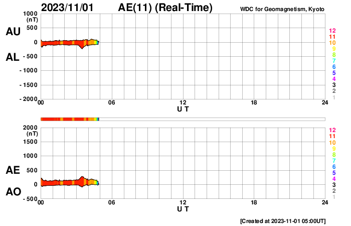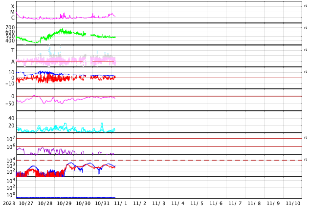 2023/11/ 1 14:15 更新 太陽風の速度は次第に低下して、やや高速になっています。 担当 篠原 久しぶりに太陽で目立つ規模の活動が発生しました。 1つ目は、今朝、1日5時(世界時10月31日20時)に、 南東の端の少し向こう側(左下)である程度の規模のフレアが発生し、 太陽の左に向かってコロナの噴出が発生しています。 SDO衛星AIA131の動画を掲載します。 このフレアの直前に、隣の領域でC3.9の小規模フレアが、 すぐ後にもC6.9の小規模フレアが発生しています。 2つ目は、1日6時(世界時10月31日21時)頃、 太陽の南側(下側)で発生したフィラメント噴出です。 こちらは、GOES衛星SUVI 304の動画を掲載します。 薄暗く見えるダークフィラメントが、 下に向かって噴き上がっています。 これらの現象により、太陽の左側と下側に向かって、 CME(コロナ質量放出)が発生しています。 SOHO衛星LASCO C2、C3の動画をご覧下さい。 どちらも横向きに飛び出している様で、 地球への影響はないでしょう。 南東の端の領域は、 今後も活動が続くのか注目してください。 太陽風は、速度が500km/秒から470km/秒へ下がり、 やや高速くらいになっています。 磁場強度は、4〜5nTと平均的な状態です。 磁場の南北成分は、小幅で南北にゆっくり変化しています。 南向きになった頃に磁気圏の活動が強まり、 AE指数で600nT程度の変化が発生していますが、 その他の時間帯は穏やかです。 今回の高速太陽風は終わりに近付いている様です。 SDO衛星AIA193を見ると、 南東の端近くにコロナホールが見えています。 次の影響はこの領域になるのでしょうか。 ![]() 太陽の北東の端の少し向こう側で発生したフレア。 (c) SDO衛星AIA131 (NASA)、(動画加工 : 宇宙天気ニュース) ![]() 太陽の南側で発生したフィラメント噴出。 (c) GOES衛星SUVI 304 (NOAA)、(動画加工 : 宇宙天気ニュース) ![]() 太陽の左側と下側へ向かって噴出するCME。 (c) SOHO衛星LASCO C2、C3 (ESA & NASA)、(動画加工 : 宇宙天気ニュース) ![]() SDO衛星のAIA193カメラによる太陽コロナの様子 (c) SDO (NASA) ![]() SDO衛星による太陽の可視光写真 (c) SDO (NASA) ![]() GOES衛星の太陽X線強度。赤・橙 = 0.1〜0.8 nm、青・紫 = 0.05〜0.4 nm (c) データ:NOAA/SWPC、作図:宇宙天気ニュース ![]() ACEが観測した太陽風の磁場(1番上の枠、白線は全体の強度、赤線は南北成分) および、太陽風の密度(3番目の橙線)、速度(4番目の黄線) (c) NOAA/SWPC ![]() AE指数(速報値) 下段のAEグラフの値が高くなると、オーロラ活動が活発化しています。 (c) 京都大学WDC ![]() ![]() 27日の太陽周期に合わせた図 太陽が同じ面を地球に向けていた27日前の変化から、今後を予想することができます。 (c) 作図:宇宙天気ニュース