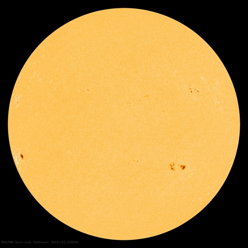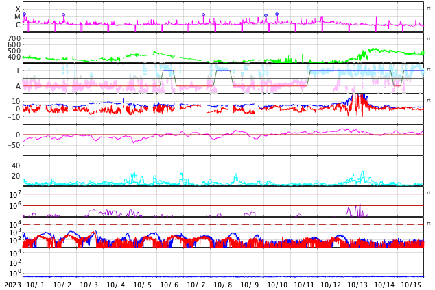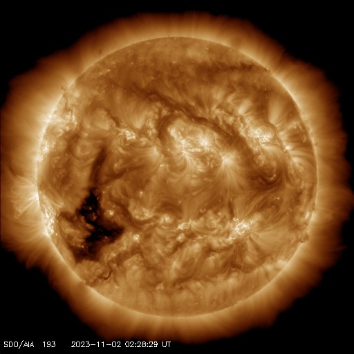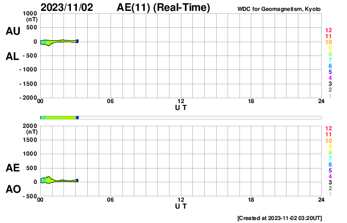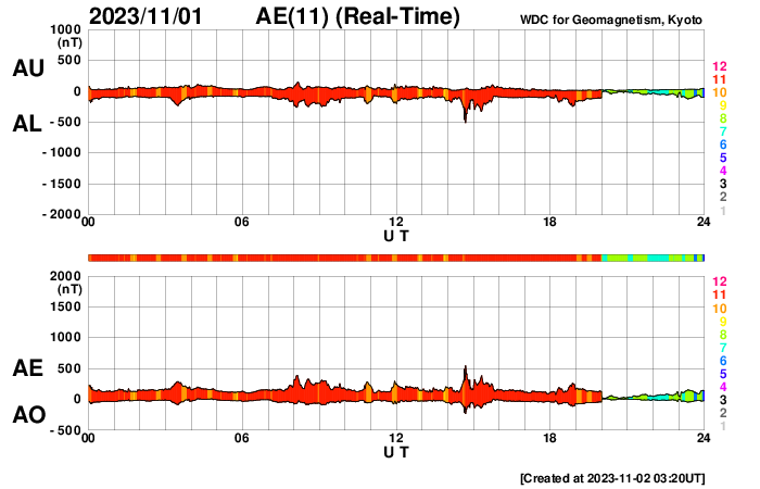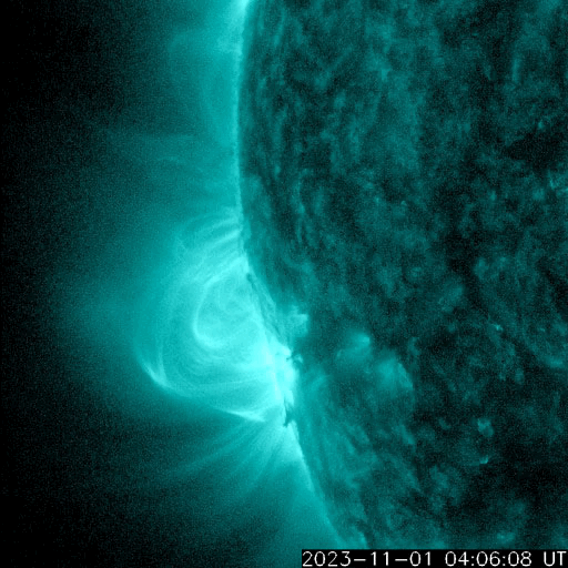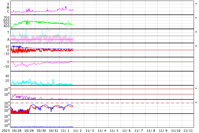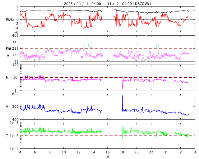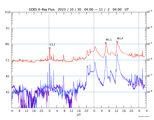 2023/11/ 2 12:31 更新 太陽の南東の端でMフレアが発生しました。太陽風は平均的な状態です。 担当 篠原 昨日のニュース以降も 太陽の南東の端(左下)の少し向こう側での活動は続き、 1日15時(世界時1日6時)にM1.1、 1日20時半(世界時1日11時半)にM1.4と、 中規模フレアが2回発生しています。 SDO衛星AIA131の動画を掲載します。 発生した領域は見えていないので、 フレアの本当の規模はこれよりも大きかったかもしれません。 CME(コロナ質量放出)は、 M1.4フレアに伴って弱い噴出が発生した程度です。 この活動領域はこれから太陽のこちら側に現れます。 注目してください。 太陽風は、速度は450km/秒前後、磁場強度は4nTと、 平均的な状態になっています。 磁場の南北成分は南北に変化していますが、 速度が下がってきたこともあり、 磁気圏は比較的穏やかで、 AE指数は小規模の変化が時々発生する程度です。 SDO衛星AIA193の太陽コロナ写真では、 南東側(左下)にコロナホールの広がりが見えています。 5〜6日後くらいからこの領域の影響で、 太陽風の速度が高まる可能性があります。