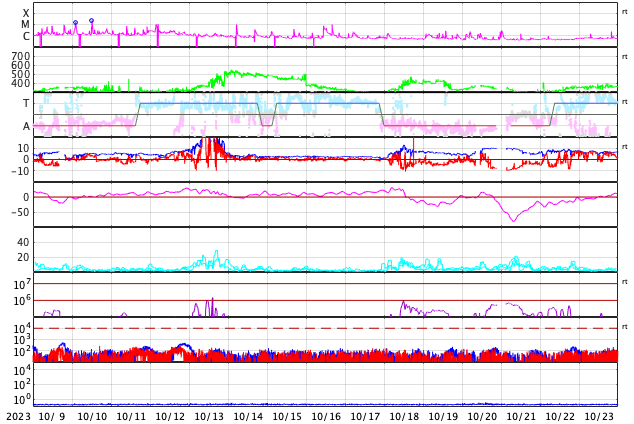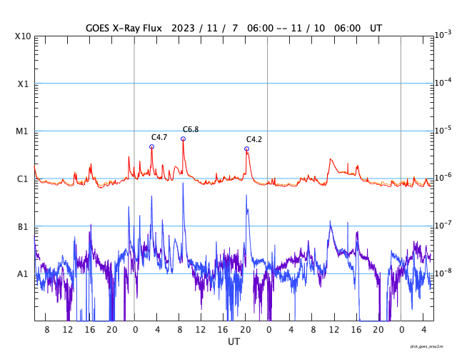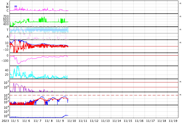GOES衛星の太陽X線強度。赤・橙 = 0.1〜0.8 nm、青・紫 = 0.05〜0.4 nm (c) データ:NOAA/SWPC、作図:宇宙天気ニュース ![]() | ||||||||||||||||||||||||||||||||||||||||||||||||||||||||||||||||||||||||||||||||||||||||||||||||||||||||||||||||||||||||||||||||||||||||||||||||||||||||||||||||||||||||||||||||||||||||||||||||||||||||||||||||||||||||||||||||||||||||||||||
