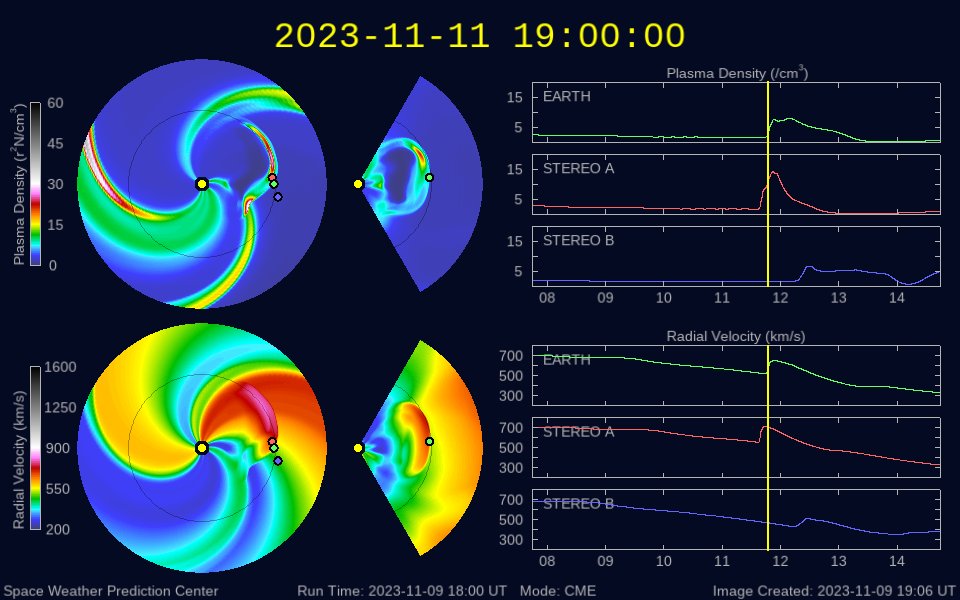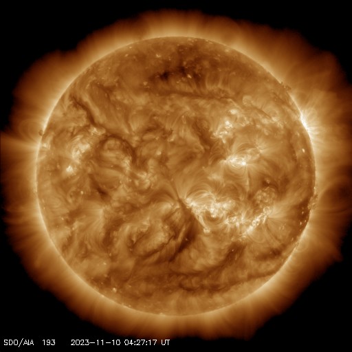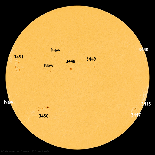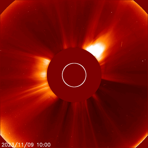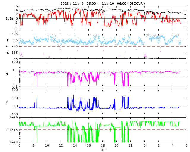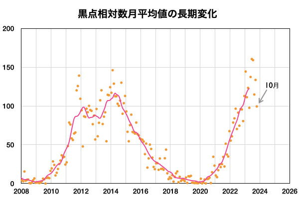 2023/11/10 14:34 更新 太陽でハロー型のCMEが発生しました。10月の黒点相対数は 99.4 でした。 担当 篠原 WDC-SILSOより、10月の黒点相対数は 99.4と発表されました。 4月の 97.6 以来の2桁で、9月の 133.6 から大きく下がりました。 1日値を見ると、10月15日までは100を超えていたのですが、 10月16〜30日にかけて2桁となり(31日は107でした)、 10月25日は 33 にまで下がっています。 可視光写真の動画でも、 途中から黒点が少なくなるのが良く分かります。 太陽活動全体から見えれば、一時的な減少でしょう。 今後の高まりの様子など、推移に注目して下さい。 太陽風は、ACE衛星のデータが停止しているため、 DSCOVR衛星のグラフを掲載します。 これによると、速度は480km/秒前後で一定になっていますが、 正しく測定できていない様に思います。 と書いていたところで、 ACE衛星の最新データだけ表示されました。 これによると、速度は670km/秒と高速の状態が続いています。 磁場強度は、4nTから3nTに少し下がり、 やや弱い状態です。 磁場の南北成分は、細かく南北に変化しています。 磁気圏はやや活動的で、 AE指数は300〜500nTの小規模の変化が度々発生しています。 SDO衛星AIA193では、 コロナホールは西の端(右端)に達して、 ほとんど見えなくなっています。 コロナホールの影響はこれから弱まりそうです。 太陽は、南西(右下)の3480黒点群で 9日20時(世界時9日11時)にC2.6の小規模フレアが発生しました。 SDO衛星AIA193の動画を見ると、 広い範囲でコロナが激しく動く様子が見えています。 この活動に伴って、CME(コロナ質量放出)が発生しています。 発生領域が太陽の中心に近いため、 SOHO衛星LASCO C2、C3を見ると、 太陽を丸く囲むように広がるハロー型のCMEになっています。 NOAA/SWPCの太陽風予報によると、 明後日の早朝、12日4時(世界時11日19時)頃に 太陽風の乱れが到来する可能性があるとのことです。 注目してください。 ![]() 太陽黒点相対数の長期変化。10月の黒点相対数は 99.4 でした。 (c) 黒点データ:WDC-SILSO、作図:宇宙天気ニュース ![]() 1975年以降の太陽黒点相対数の長期変化。 (c) 黒点データ:WDC-SILSO、作図:宇宙天気ニュース ![]() 10月の太陽黒点の推移。SDO衛星。 (c) SDO衛星 (NASA)、(動画加工 : 宇宙天気ニュース) ![]() C2.6の小規模フレアでは、広い領域で変化が発生しています。 (c) SDO衛星AIA193 (NASA)、(動画加工 : 宇宙天気ニュース) ![]() 太陽を丸く囲むように広がるハロー型のCMEが発生しています。 (c) SOHO衛星LASCO C2、C3 (ESA & NASA)、(動画加工 : 宇宙天気ニュース) ![]() 太陽風の乱れは、12日4時(世界時11日19時)頃に到来する可能性があります。 (c) NOAA/SWPC ![]() SDO衛星のAIA193カメラによる太陽コロナの様子 (c) SDO (NASA) ![]() SDO衛星による太陽の可視光写真。マウスの矢印を写真に重ねると、黒点番号付きの写真に切り替わります。 (c) SDO (NASA) ![]() DSCOVRが観測した太陽風の磁場(黒線は全体の強度、赤線は南北成分) 磁場の向き、プラズマの密度、速度、温度 (c) データ:NOAA/SWPC、作図:宇宙天気ニュース ![]() ACEが観測した太陽風の磁場(1番上の枠、白線は全体の強度、赤線は南北成分) および、太陽風の密度(3番目の橙線)、速度(4番目の黄線) (c) NOAA/SWPC ![]() AE指数(速報値) 下段のAEグラフの値が高くなると、オーロラ活動が活発化しています。 (c) 京都大学WDC ![]() ![]() 27日の太陽周期に合わせた図 太陽が同じ面を地球に向けていた27日前の変化から、今後を予想することができます。 (c) 作図:宇宙天気ニュース